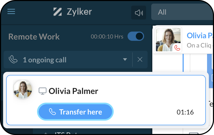 1. モバイルデバイスからWebブラウザデバイスへ1対1通話を転送するには、LHSで進行中の通話を選択してこちらへ転送を選択します。