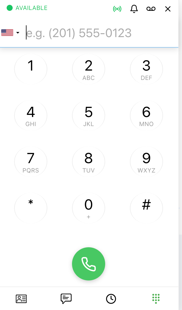 を選択した場合は、電話番号を入力できるキーパッドが表示されます。連絡先リスト、SMS、通話履歴にもアクセスできます。