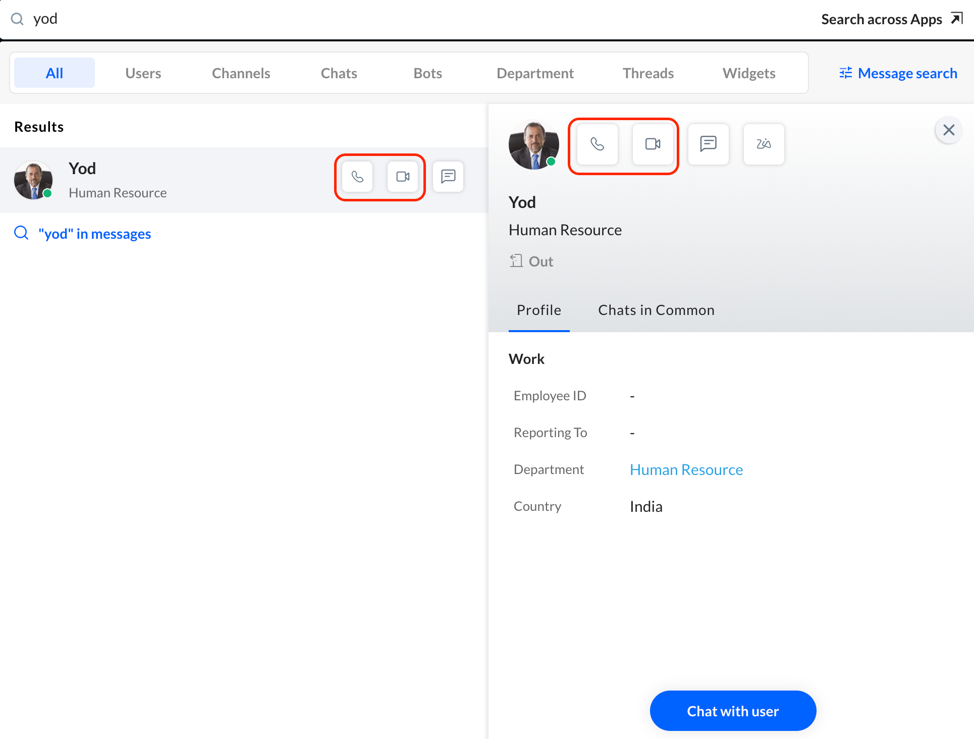 検索結果に表示されたユーザー名にカーソルを合わせて通話アイコンをクリックするか、ユーザーのプロフィール内の通話アイコンをクリックして通話を開始できます。