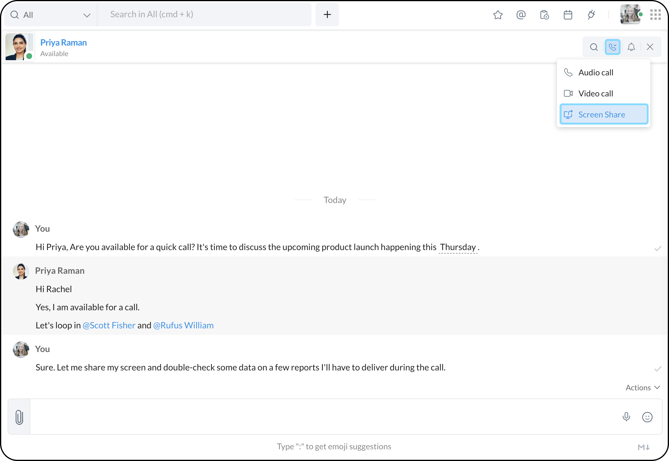 2. 音声/ビデオ通話または画面共有を行うことができます。ドロップダウンメニューから 画面共有 を選択します。