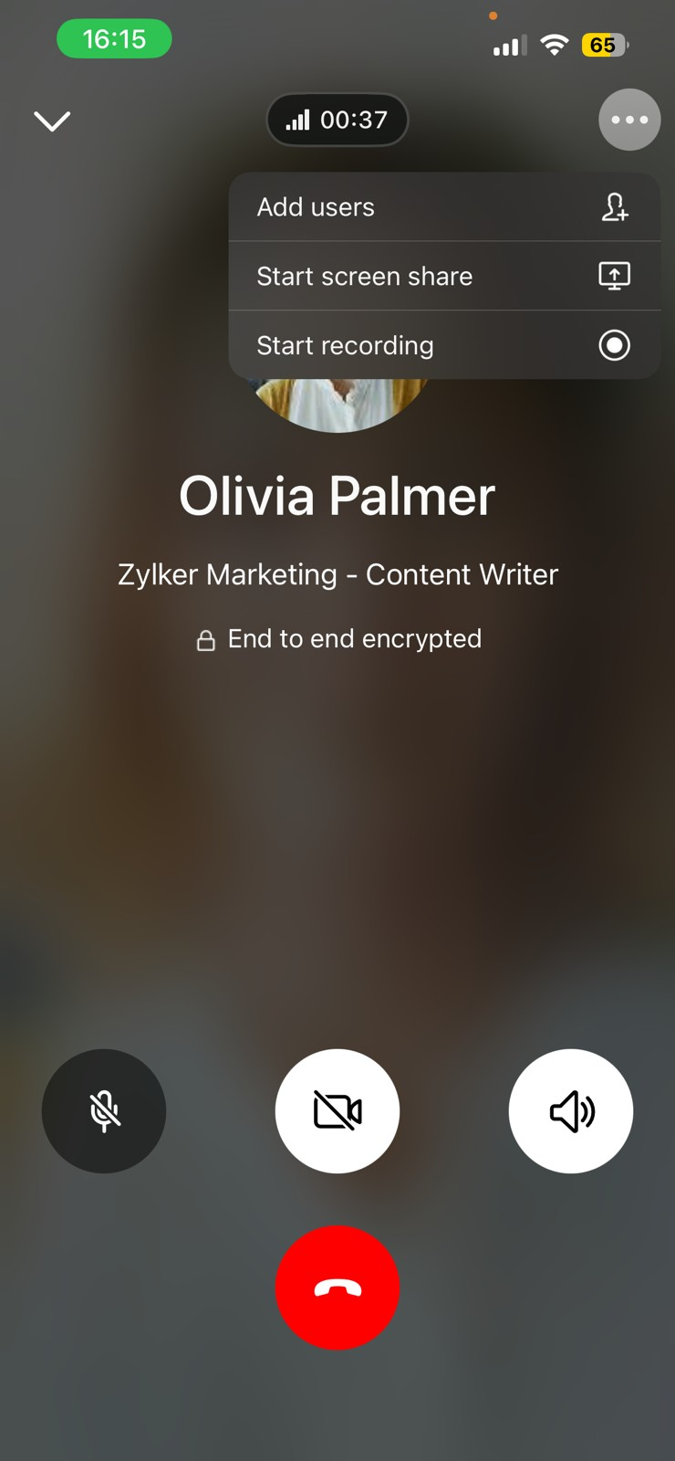 三点リーダー: iOS デバイスで三点リーダーをタップすると、ユーザーを追加、画面共有を開始、録画を開始の 3 つの設定が表示されます。