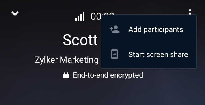 v. その他(三点リーダー): Android デバイスで三点リーダーをタップすると、参加者を追加と画面共有を開始の 2 つの設定が表示されます。