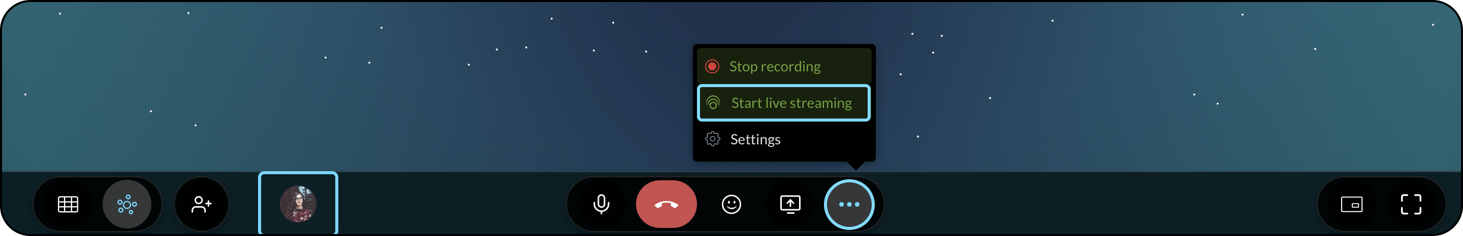 2. 会議画面の「三つ点」のアイコンをクリックし、「ライブストリーミングを開始」を選択します。