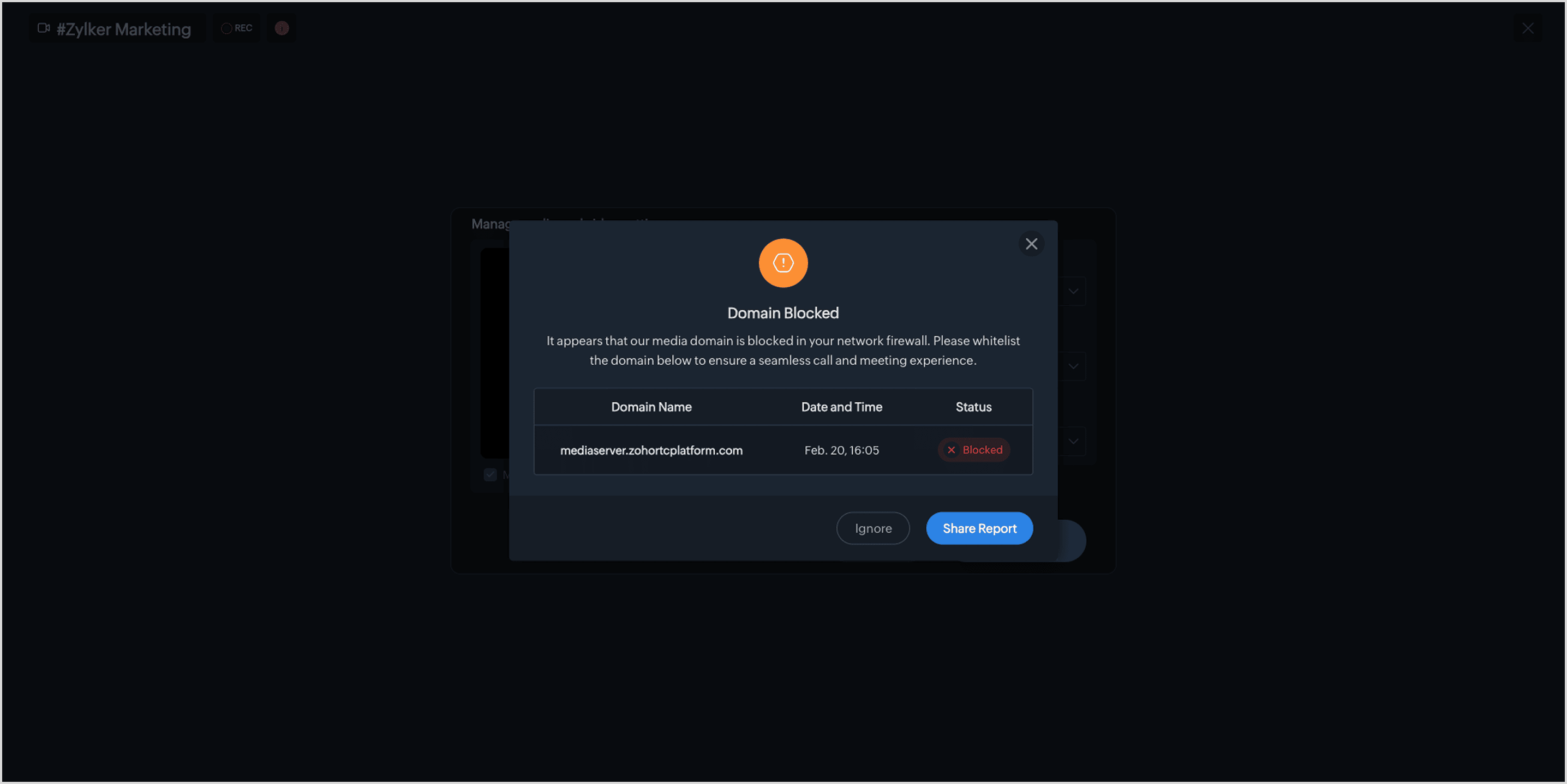 1.  もしメディアのドメインが通話や予定の開始時にブロックされている場合、以下の画像に示されているようなプロンプトが表示されます。