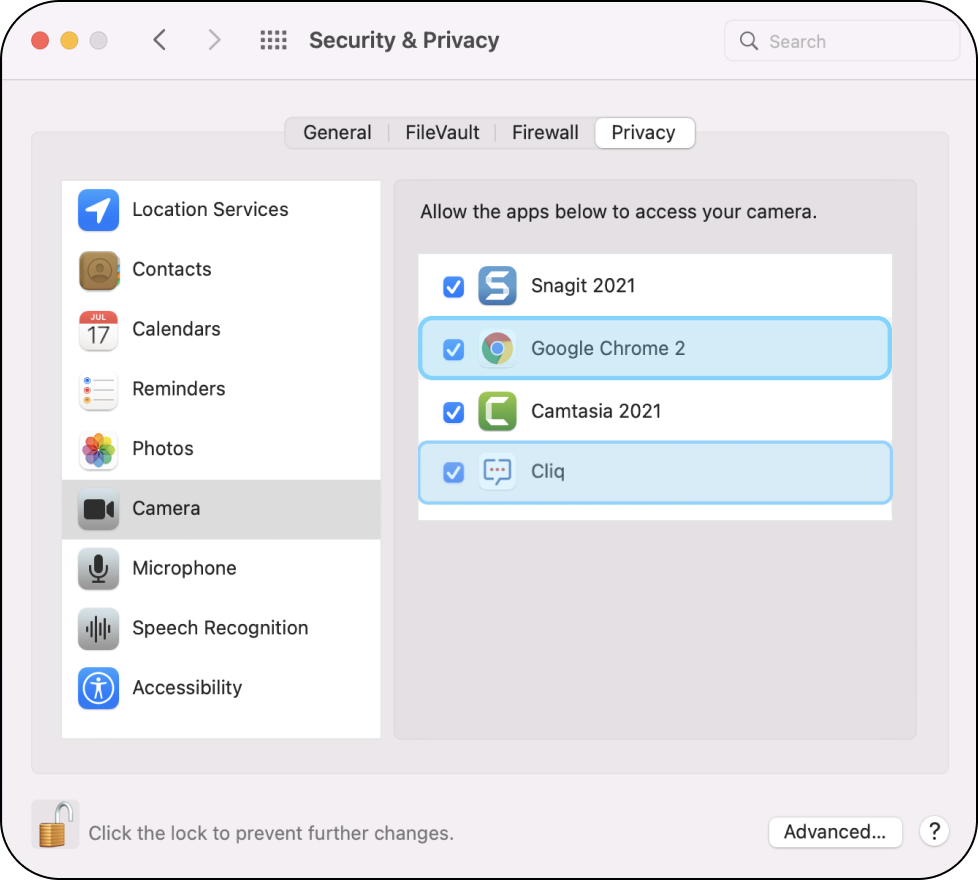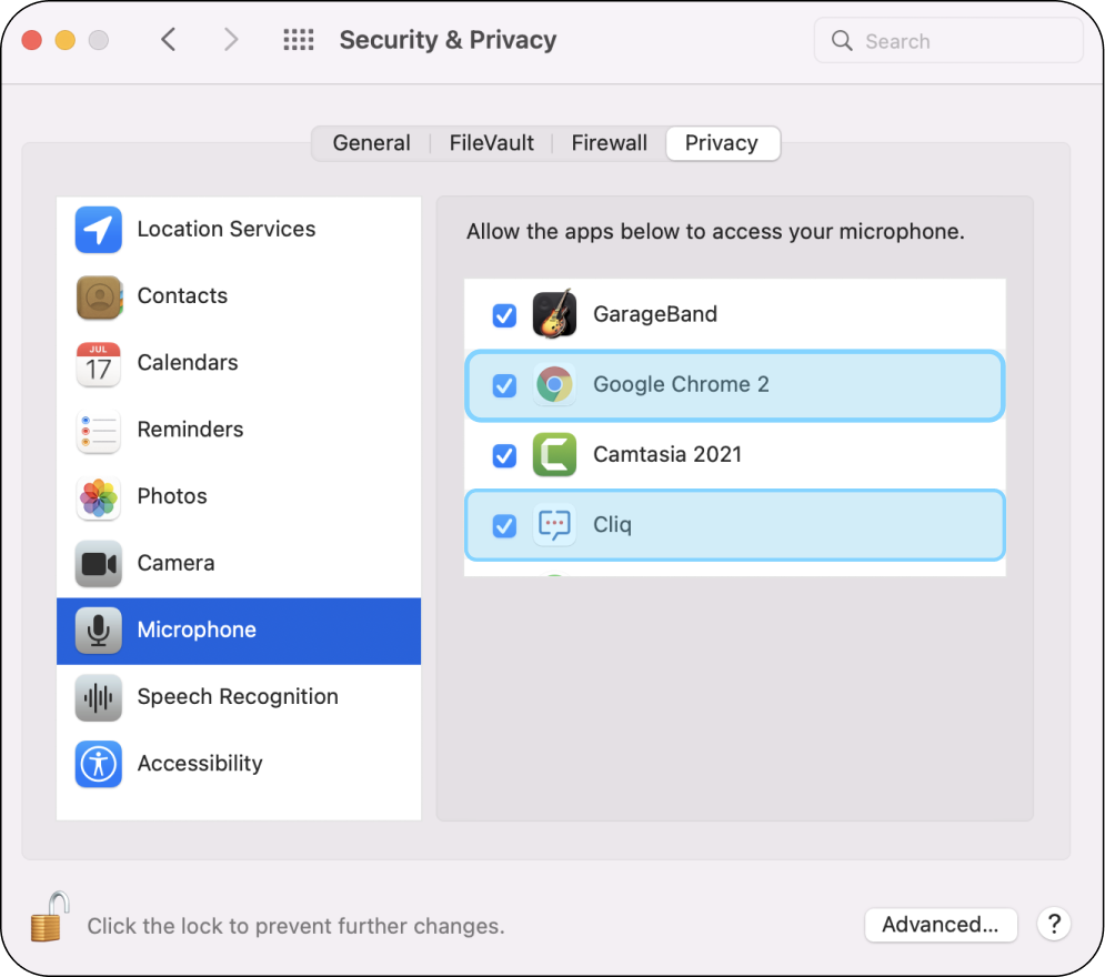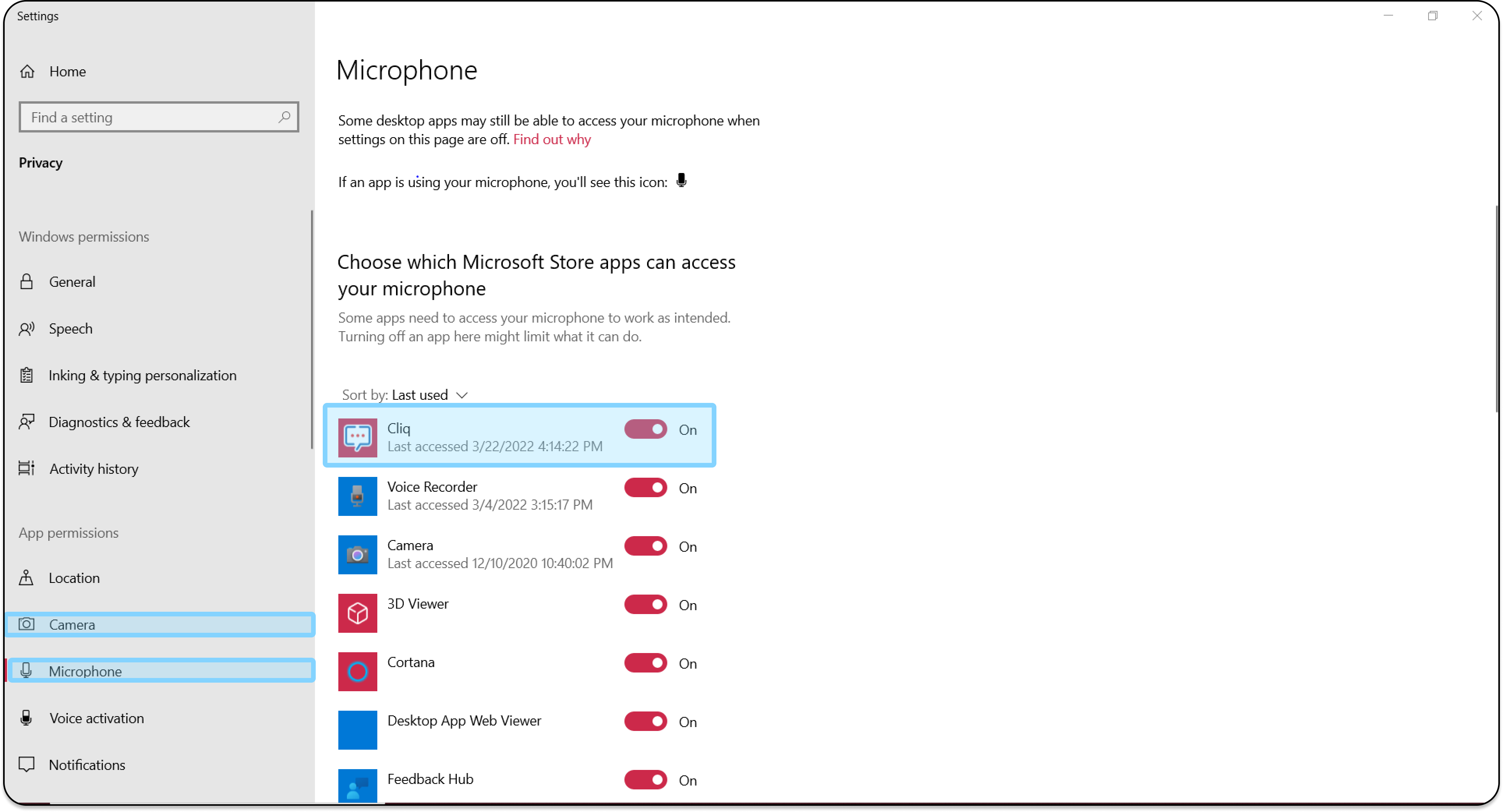 - Cliqアプリケーションのマイク/カメラアクセスを有効にします