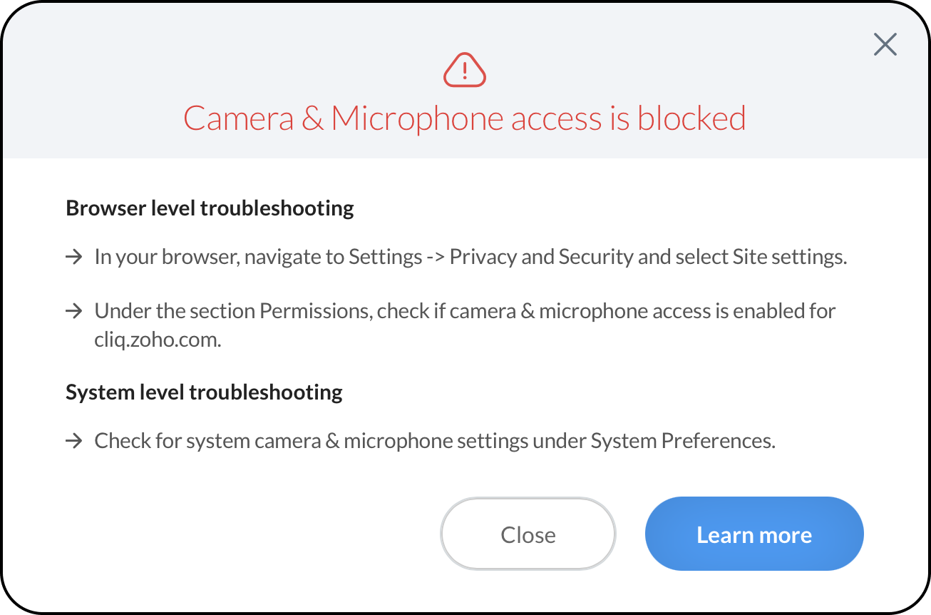 以下の手順に従って、システムおよびブラウザでカメラとマイクのアクセスを有効にします。