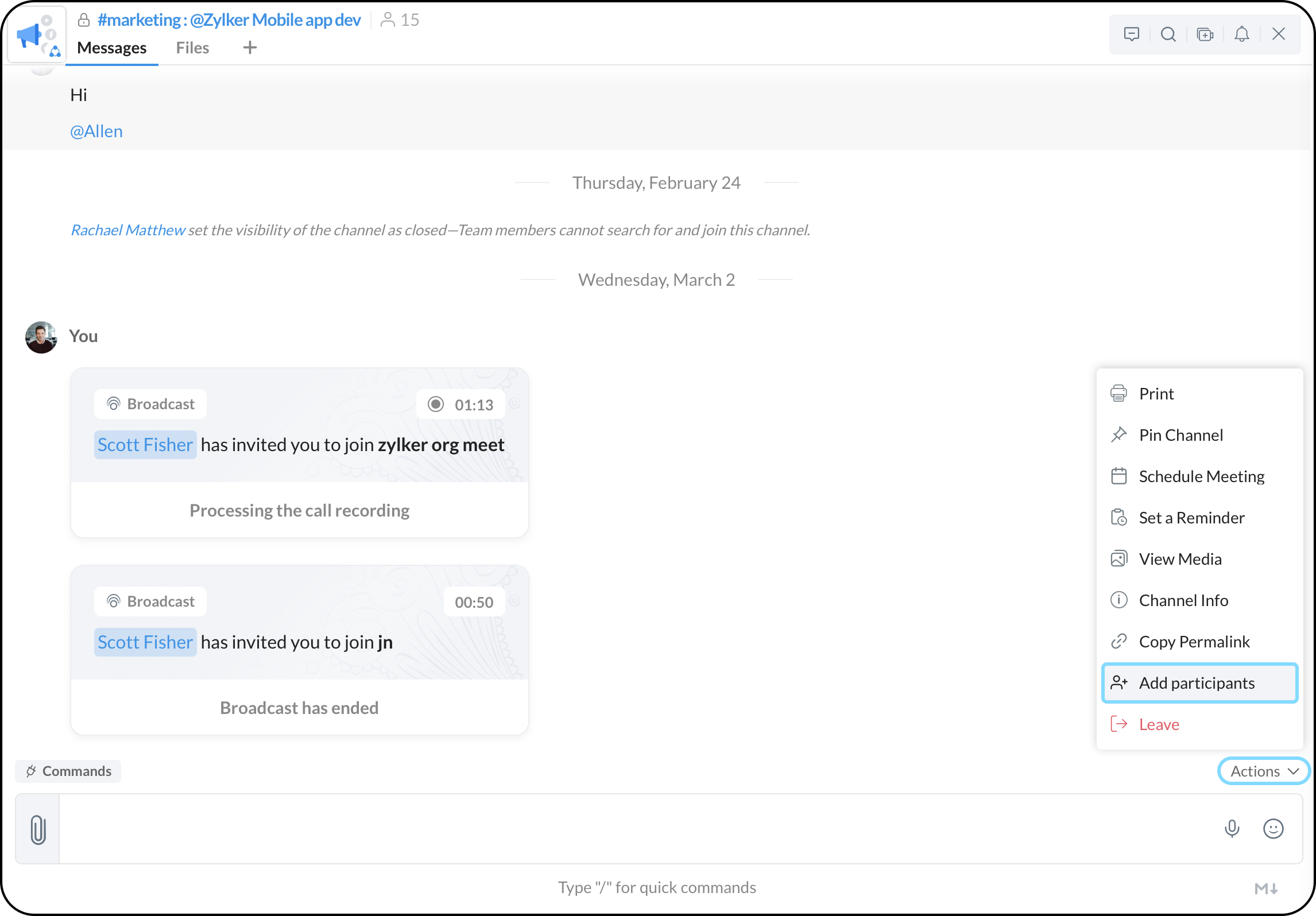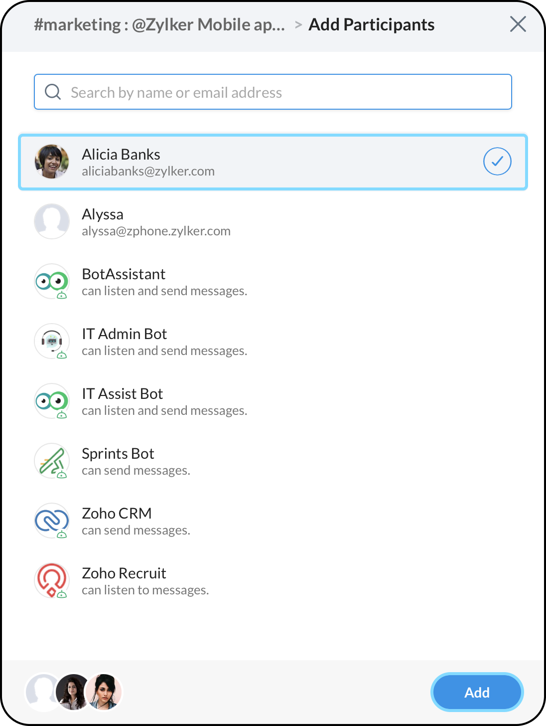 チャットウィンドウで、「アクション」を選択し、「参加者を追加」をクリックします。提案リストから参加者を選択することができます。