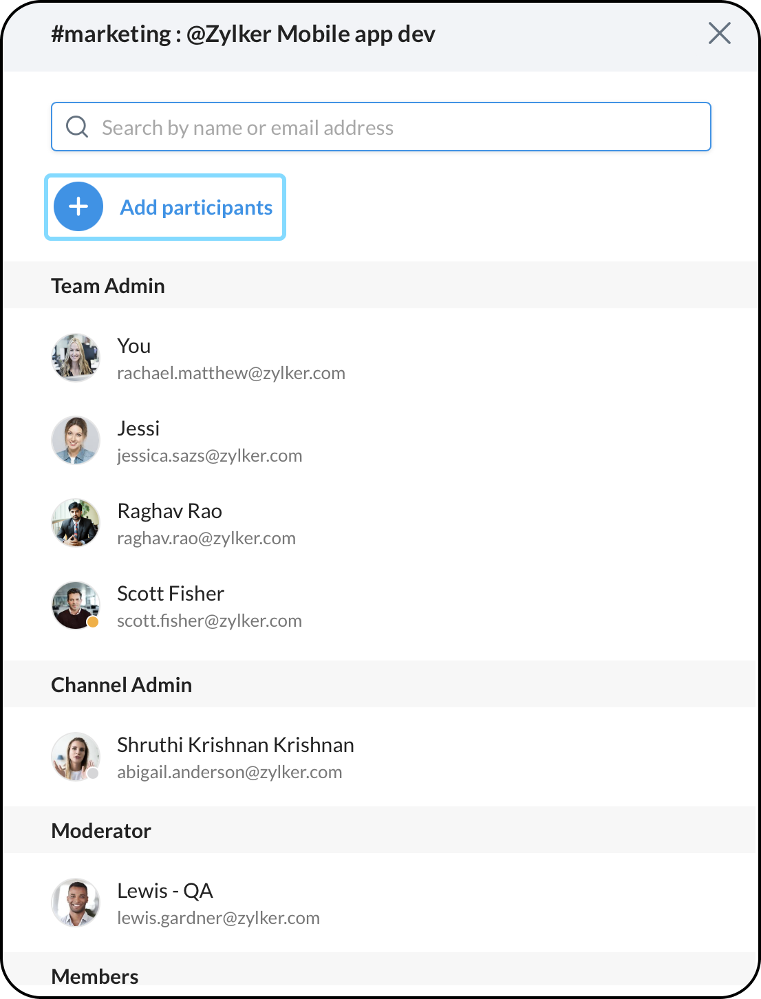 参加者を追加するボタンとチャンネル参加者のリストが表示されるダイアログウィンドウが表示されます。 参加者を追加を選択します。表示されたダイアログウィンドウで追加したい参加者を選択し、 追加ボタンをクリックします。