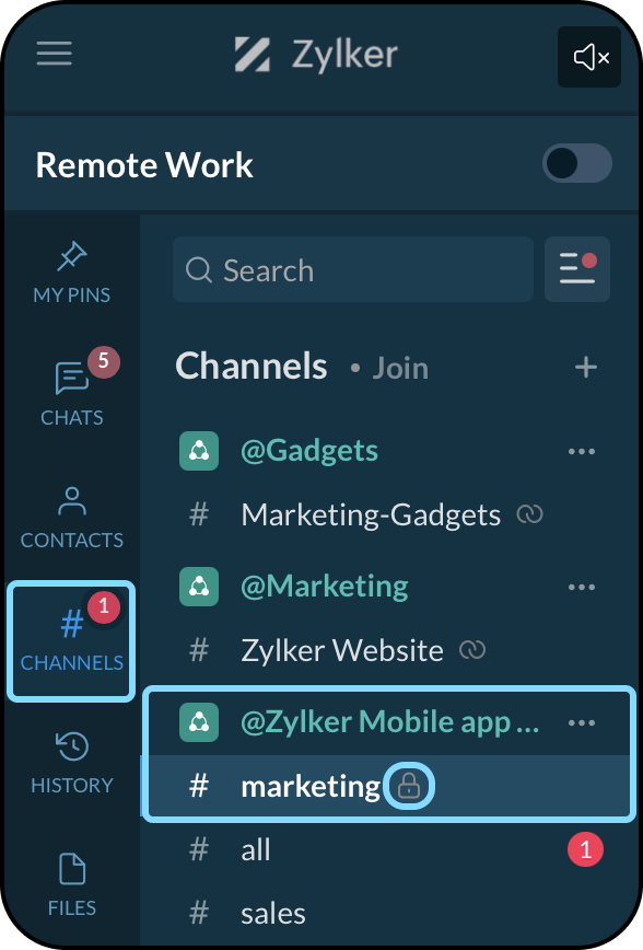 ZylkerMobile Appチームには、招待制のチャンネル #marketing があります。このチャンネルには、モバイルアプリケーションマーケティング活動を行っているマーケターのみがアクセスできます。