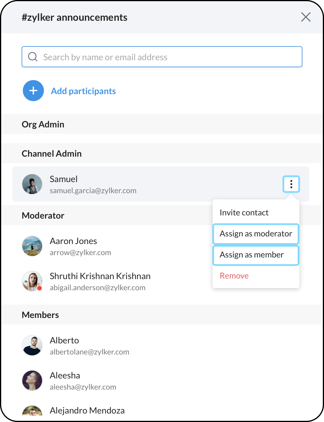 • モデレーター は、メンバーを削除することができます。スーパー管理者または管理者によって、管理者またはメンバーの役割として割り当てることができます。
