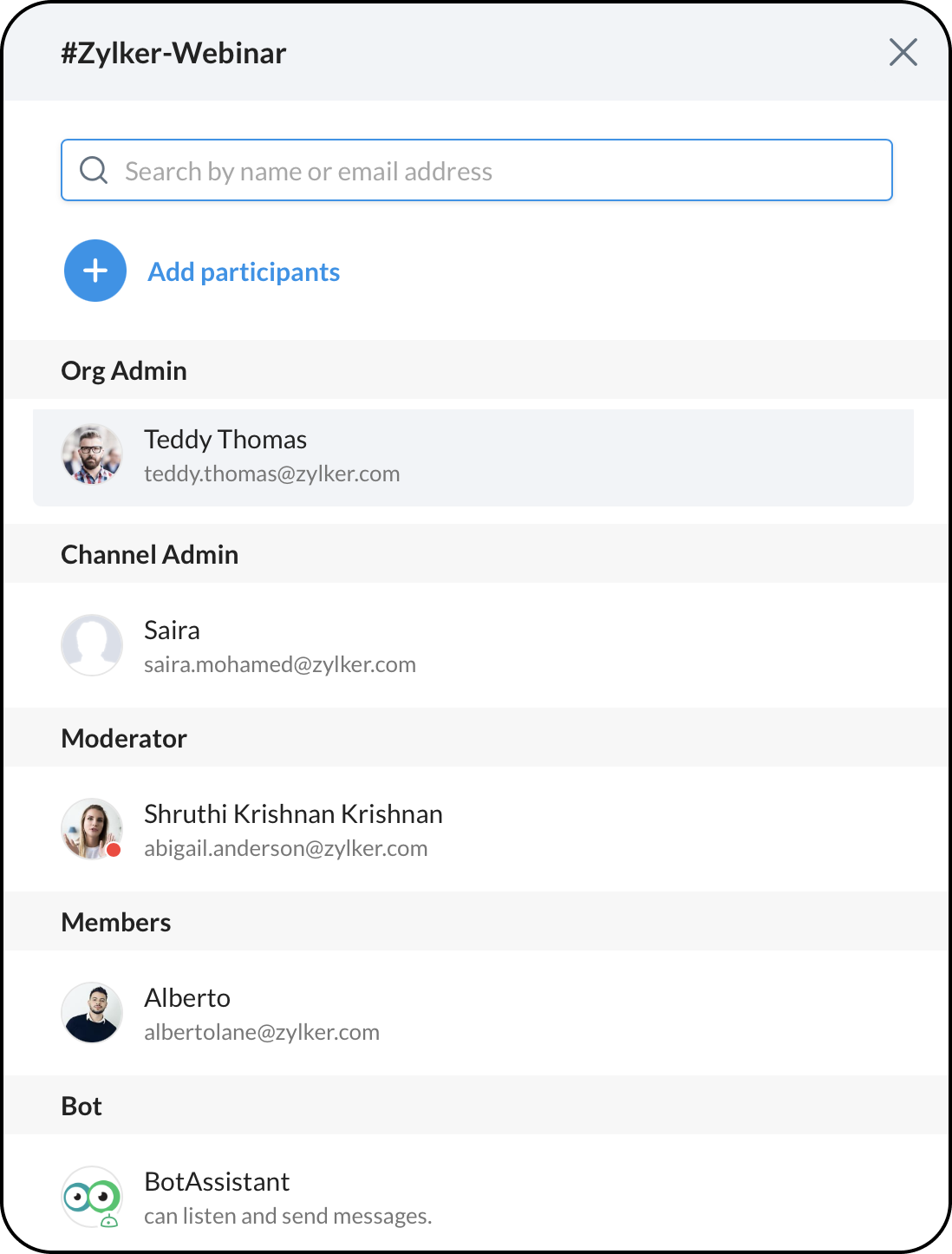 チャンネルのメンバーは、与えられた権限に基づいてチャンネルアクションを実行するため、特定の役割を果たします。チャンネルには5つの役割があります: スーパー管理者、チャンネル管理者、モデレータ、メンバー および ボットです。