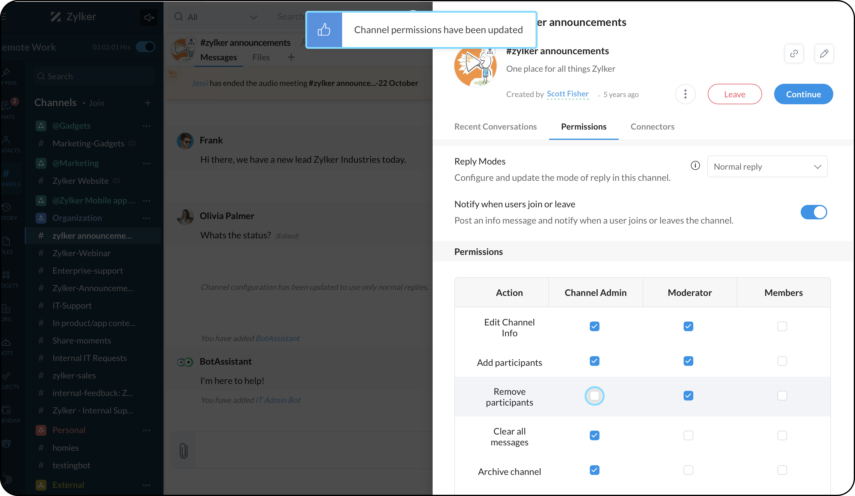 3. その後、チャネル権限が成功裏に更新されたことを示すバナーメッセージが表示されます。