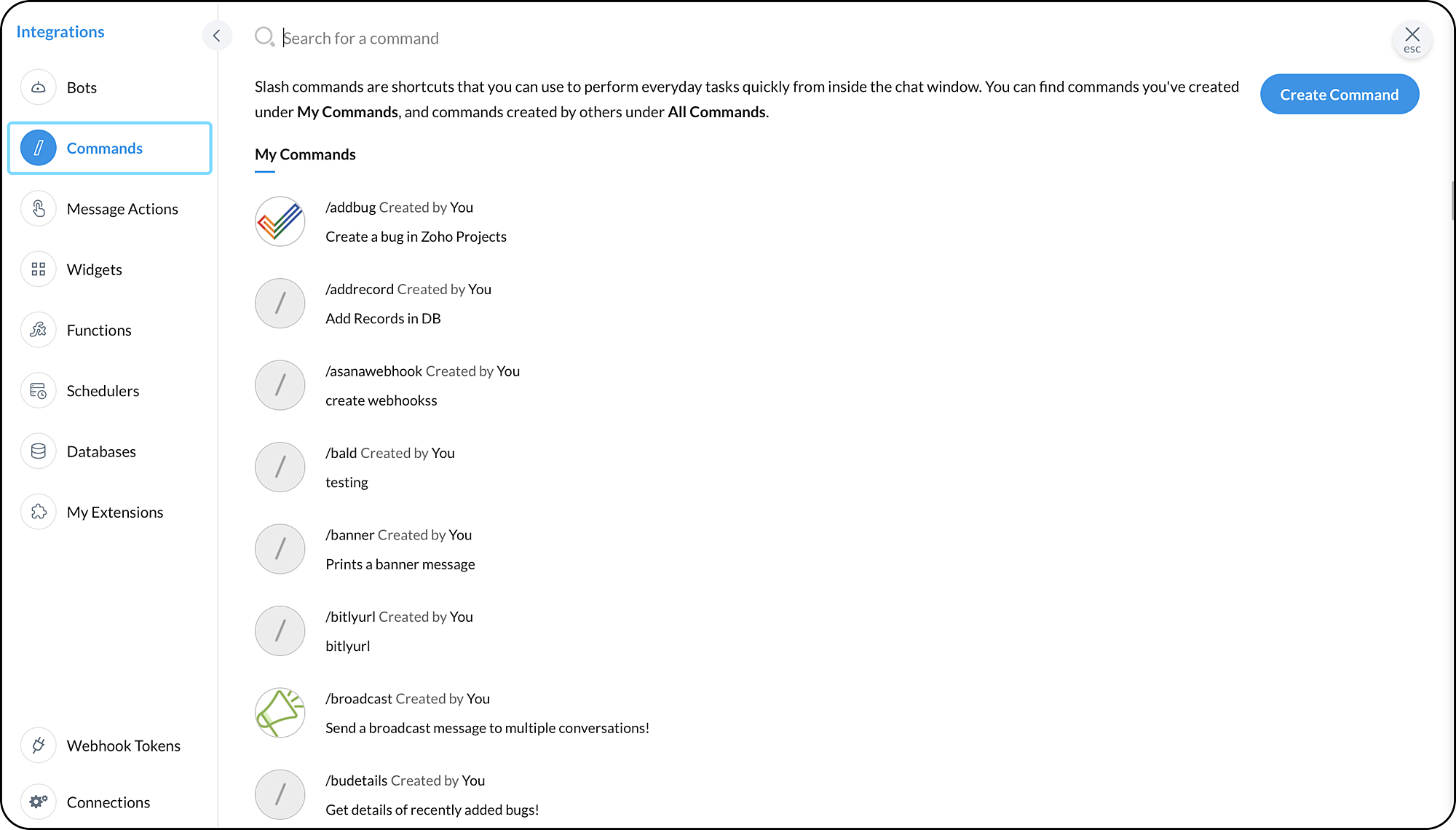 2. 利用可能なコマンドのリストが表示されます。「マイコマンド」の下には、作成したコマンドが表示されます。そして「すべてのコマンド」の下には、他のユーザーが作成したコマンドが表示されます。