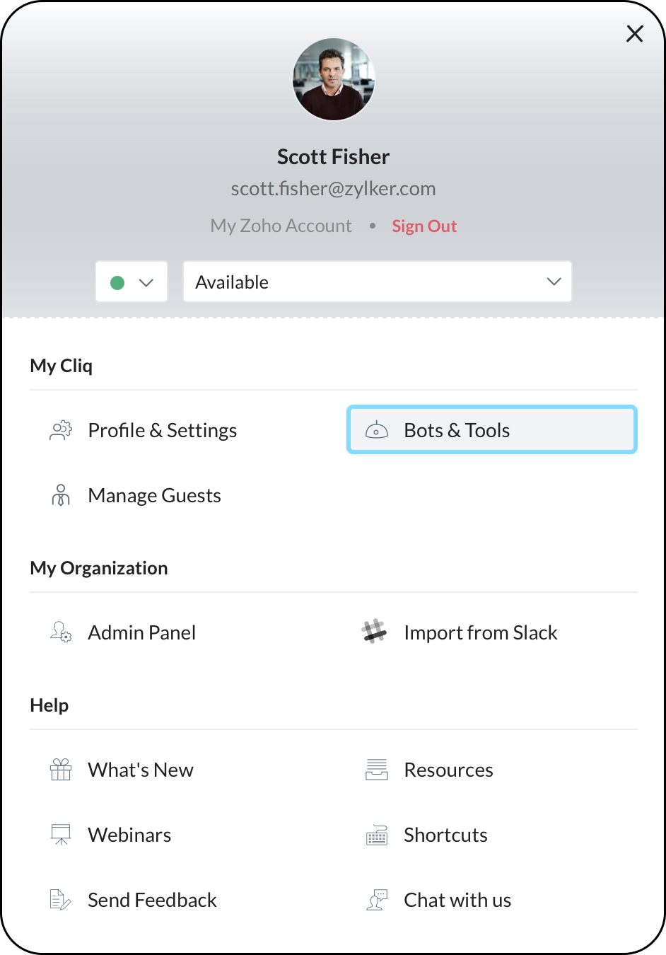 2. ユーザーパネル内のMy Cliqから、 Bots & Tools を選択してください。