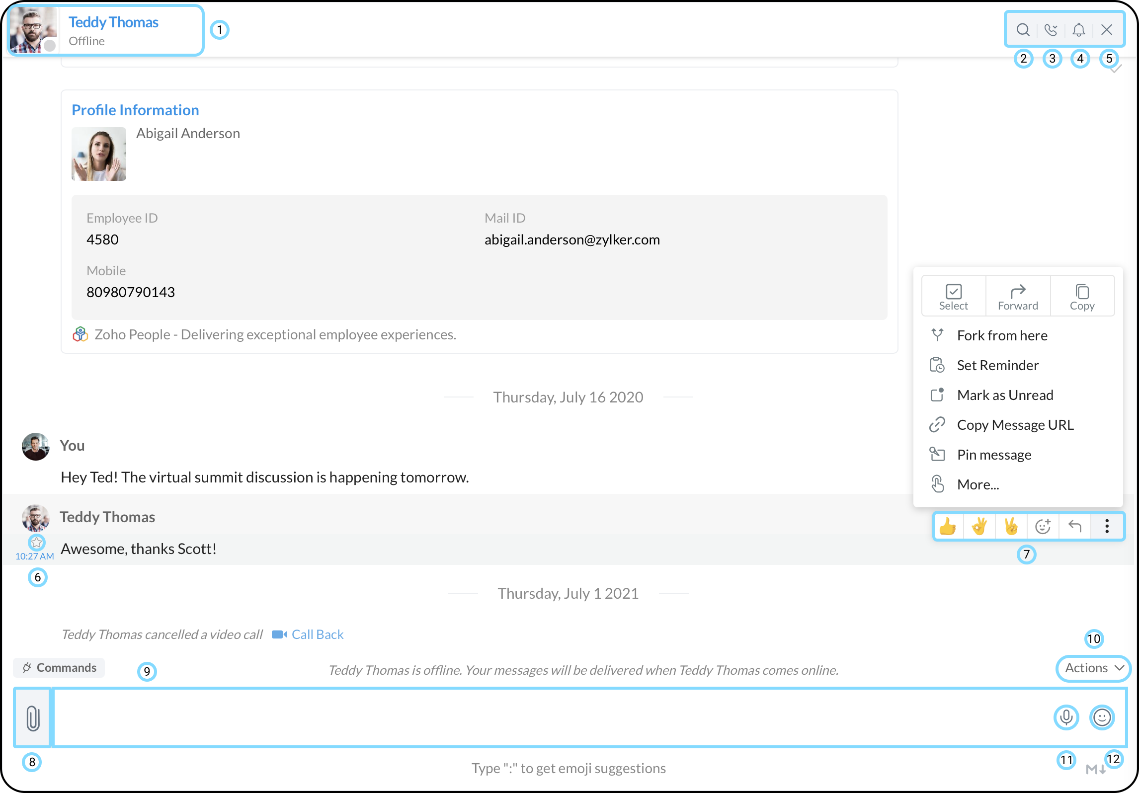 7. メッセージ操作 - メッセージをホバーすると、6つの可能な 操作が表示されます