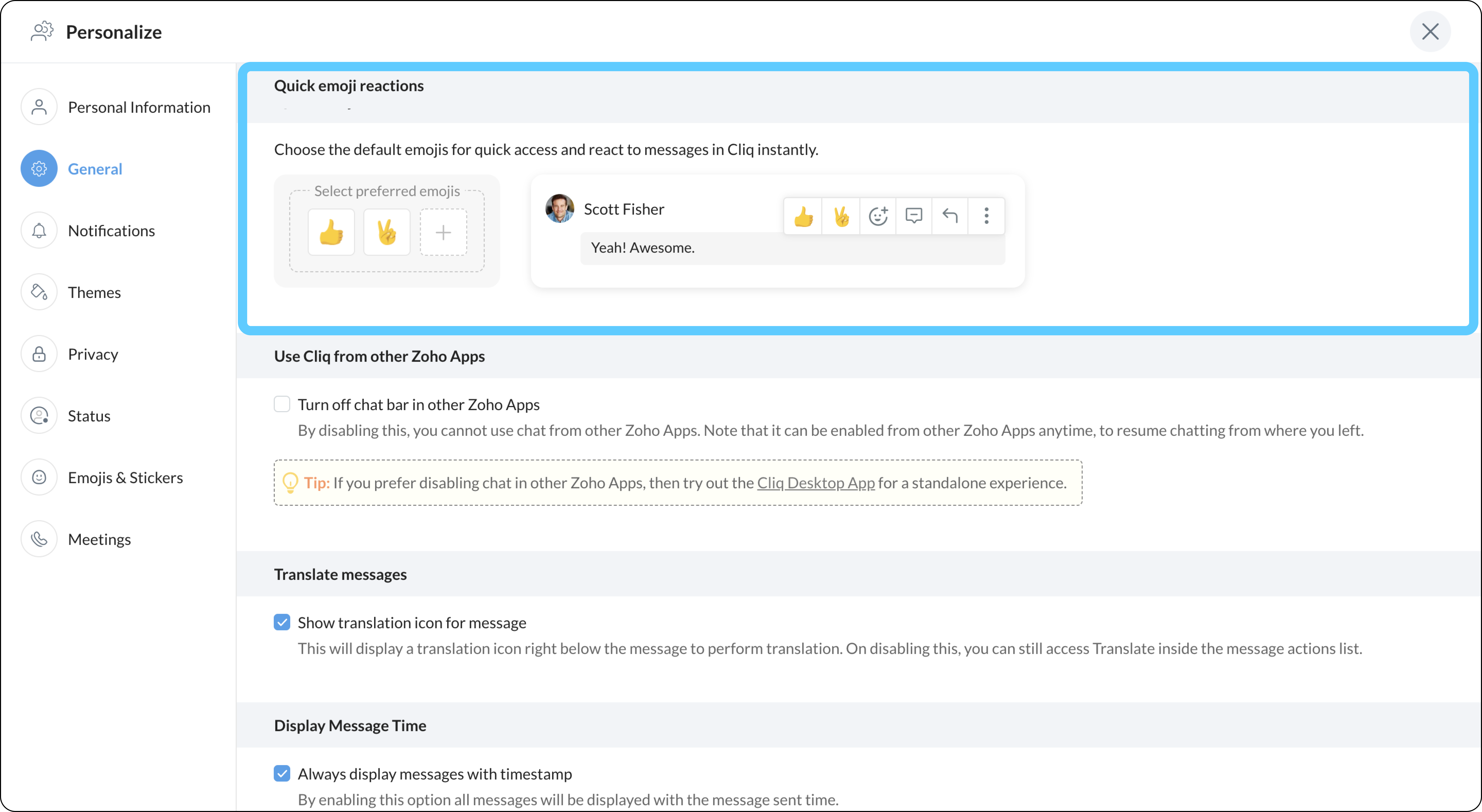 クイック絵文字を設定するには、「プロフィールと設定」-> 「一般」に進み、「クイック絵文字リアクション」をスクロールしてください。