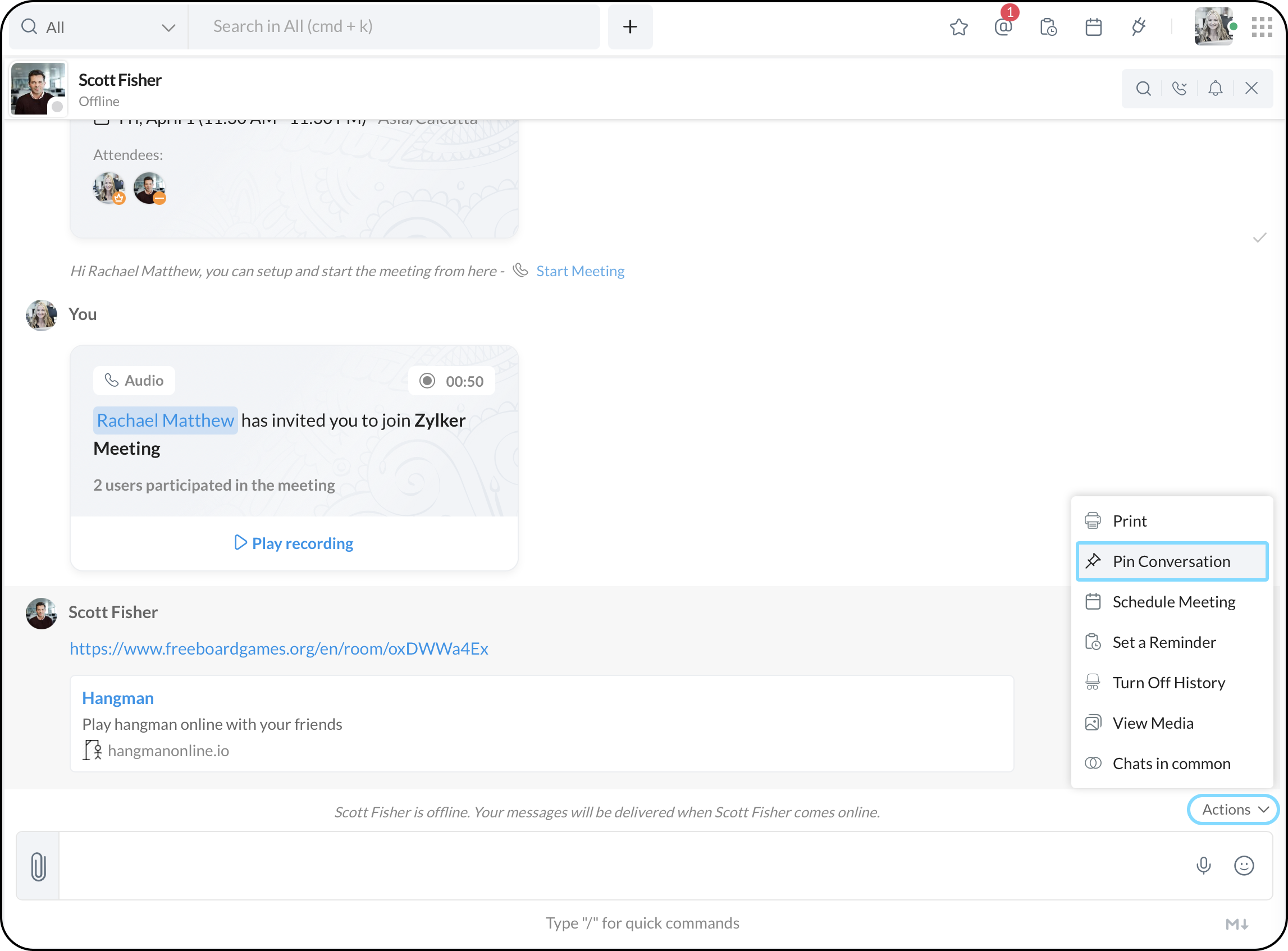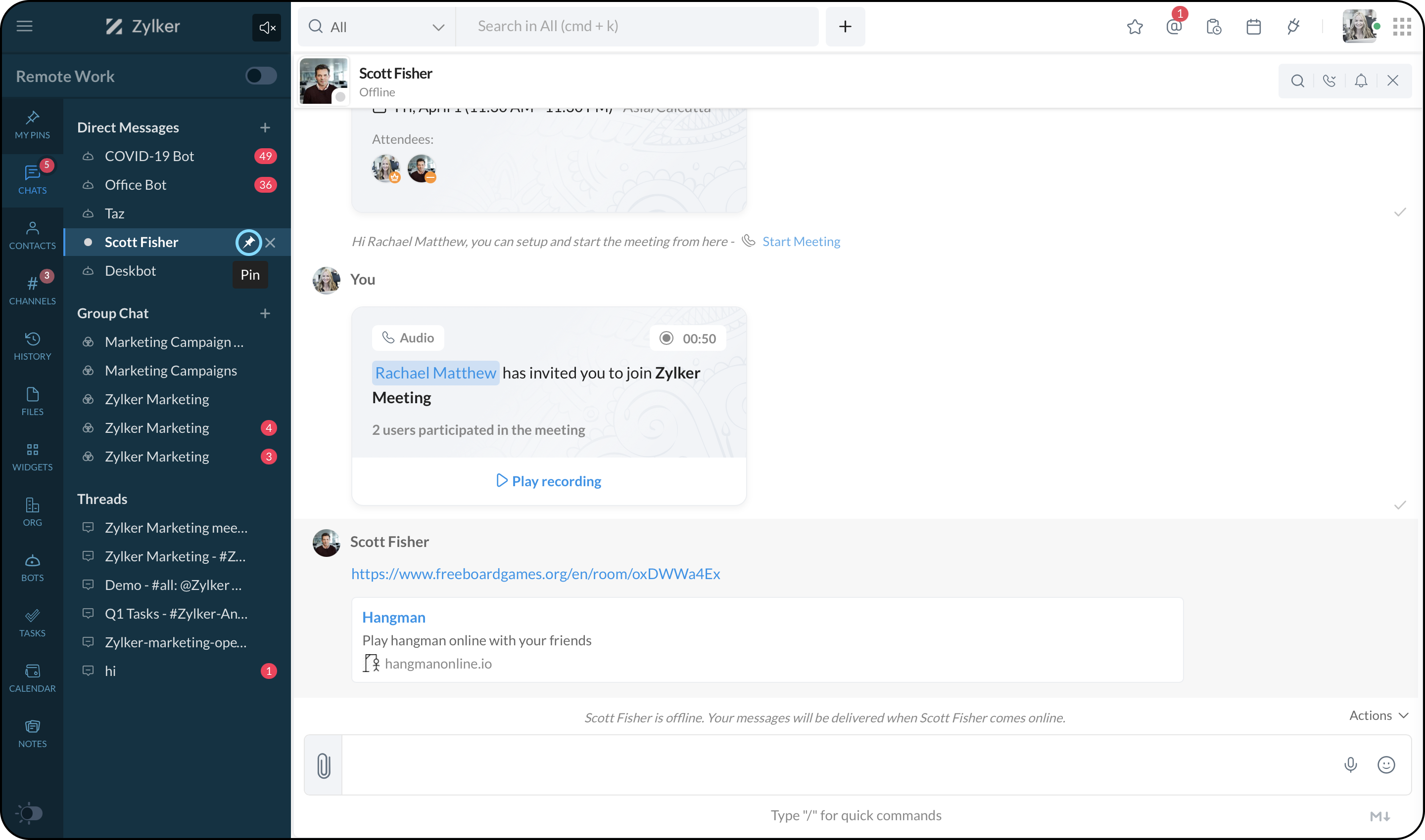 チャット、チャンネル、ボットを常にサイドバーの「マイピン」にピン留めすることができます。この方法で、毎回検索する必要がなくなります。