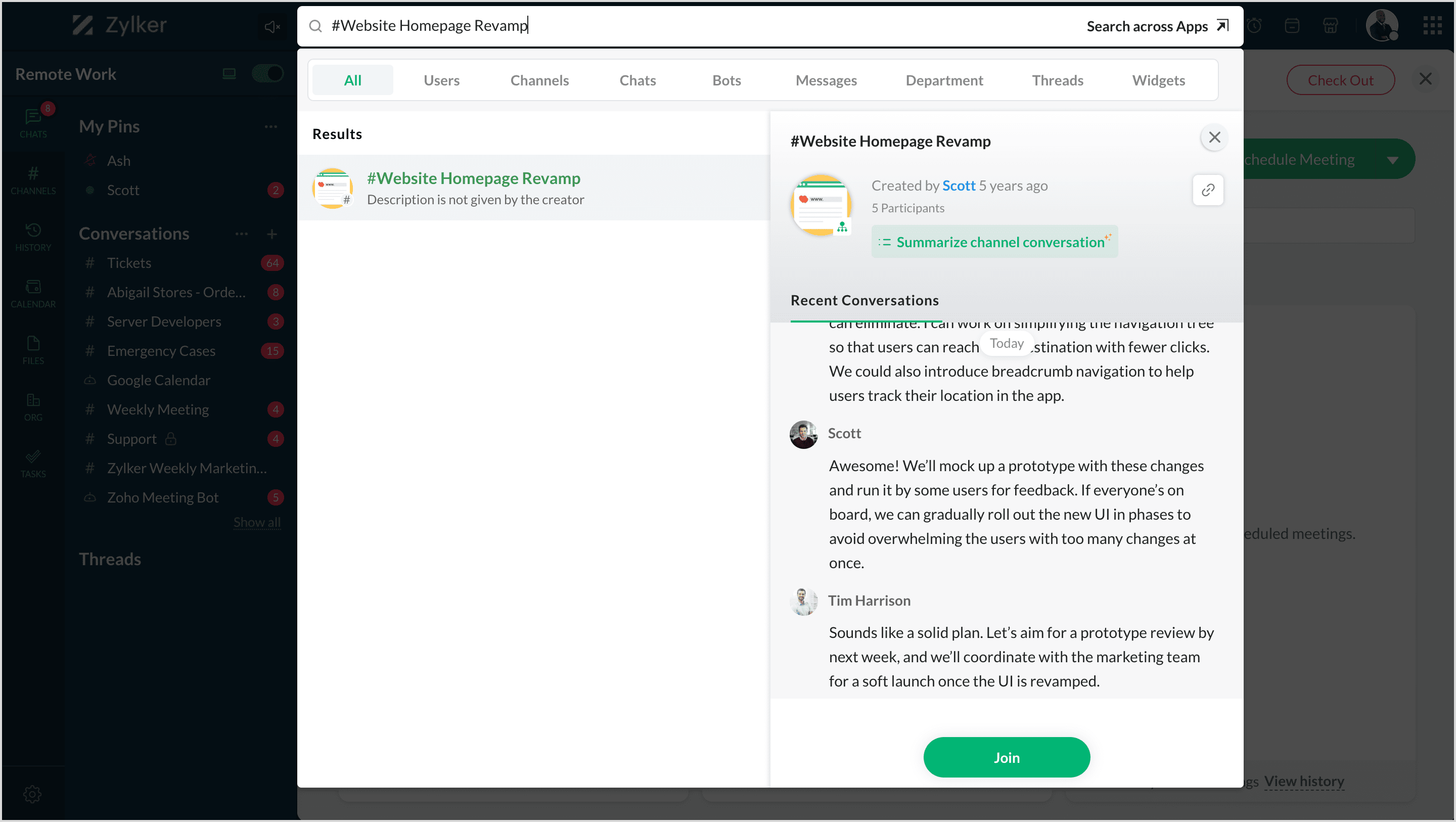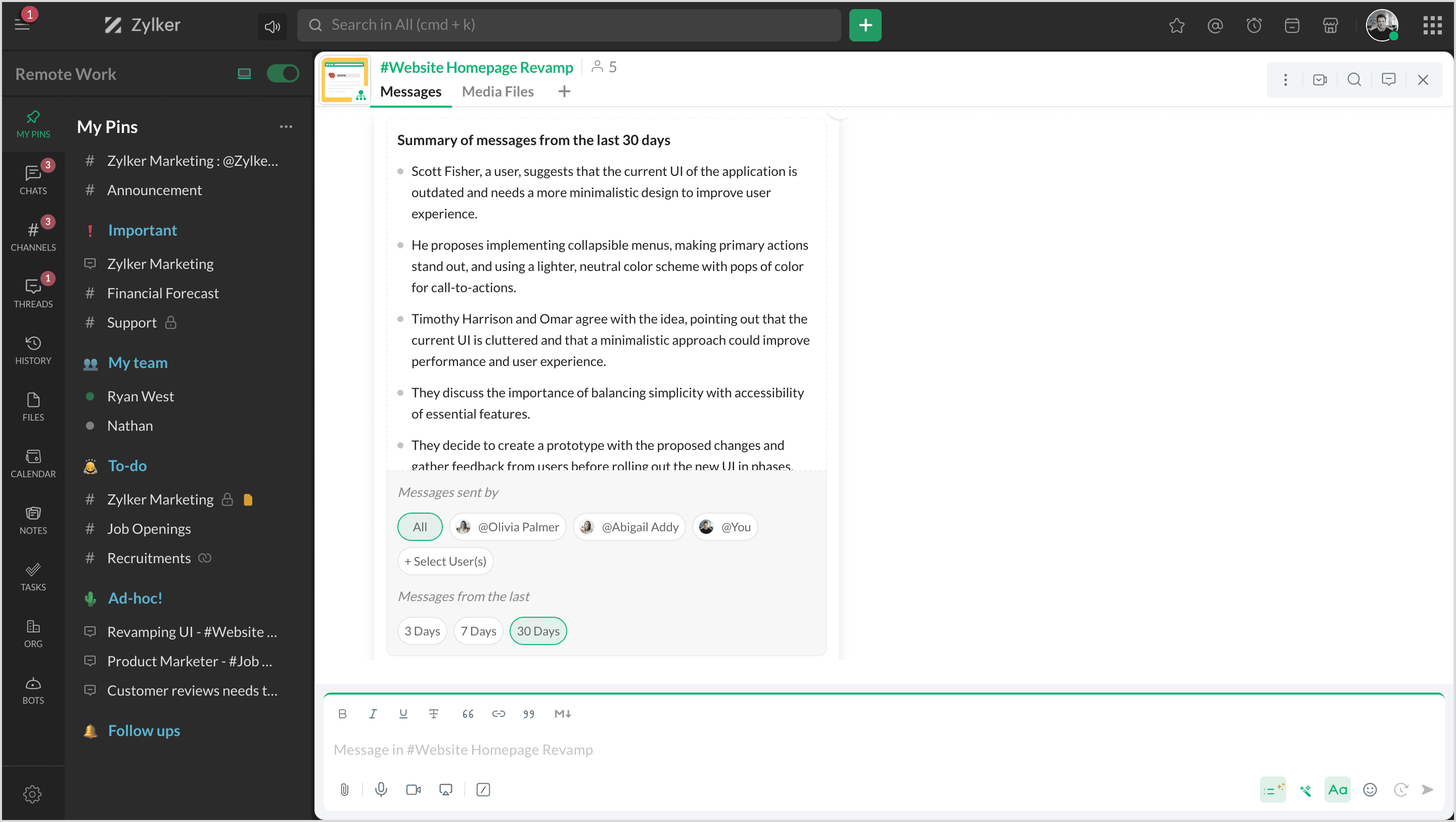Zoho Cliqのchat概要機能を使用すると、ユーザーはチャットやチャンネルでの進行中のディスカッションの最新情報をすばやく取得することができます。これにより、多数のメッセージを探して情報を得る必要がなくなります。