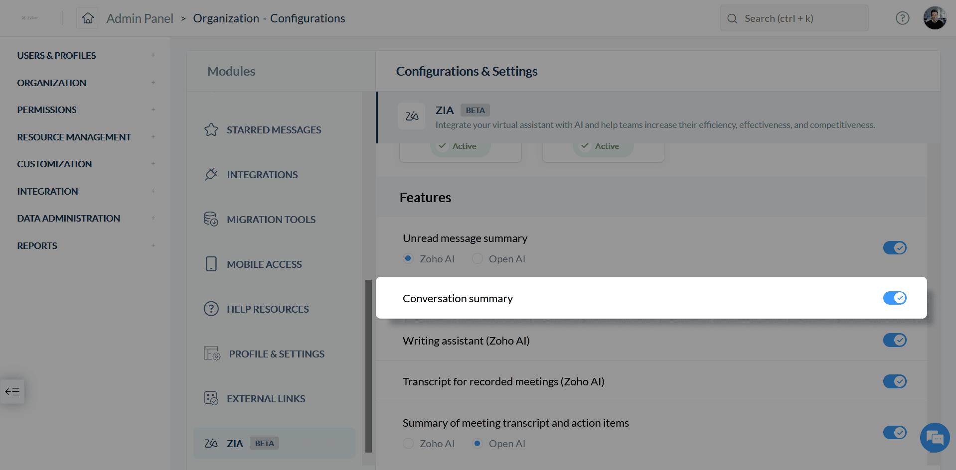 Notes注意: 有効化すると、Zoho Cliqは、あなたの組織がこの機能を管理するためのAIポータルを構築します。
