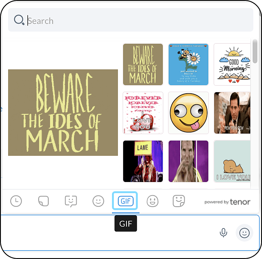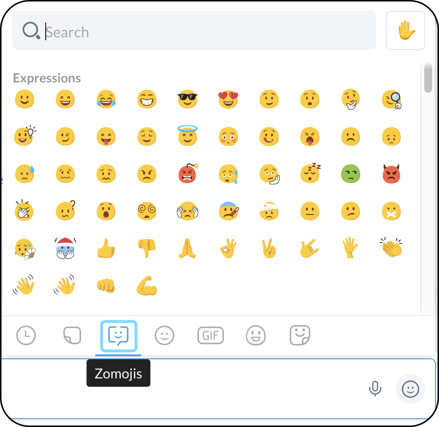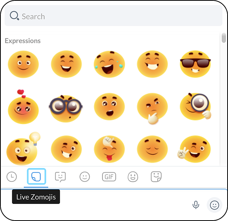 2. Live ZomojisZomojisEmojisGIFsカスタムEmojisスティッカーから選択します。特定の反応を検索するには、検索バーに入力します。