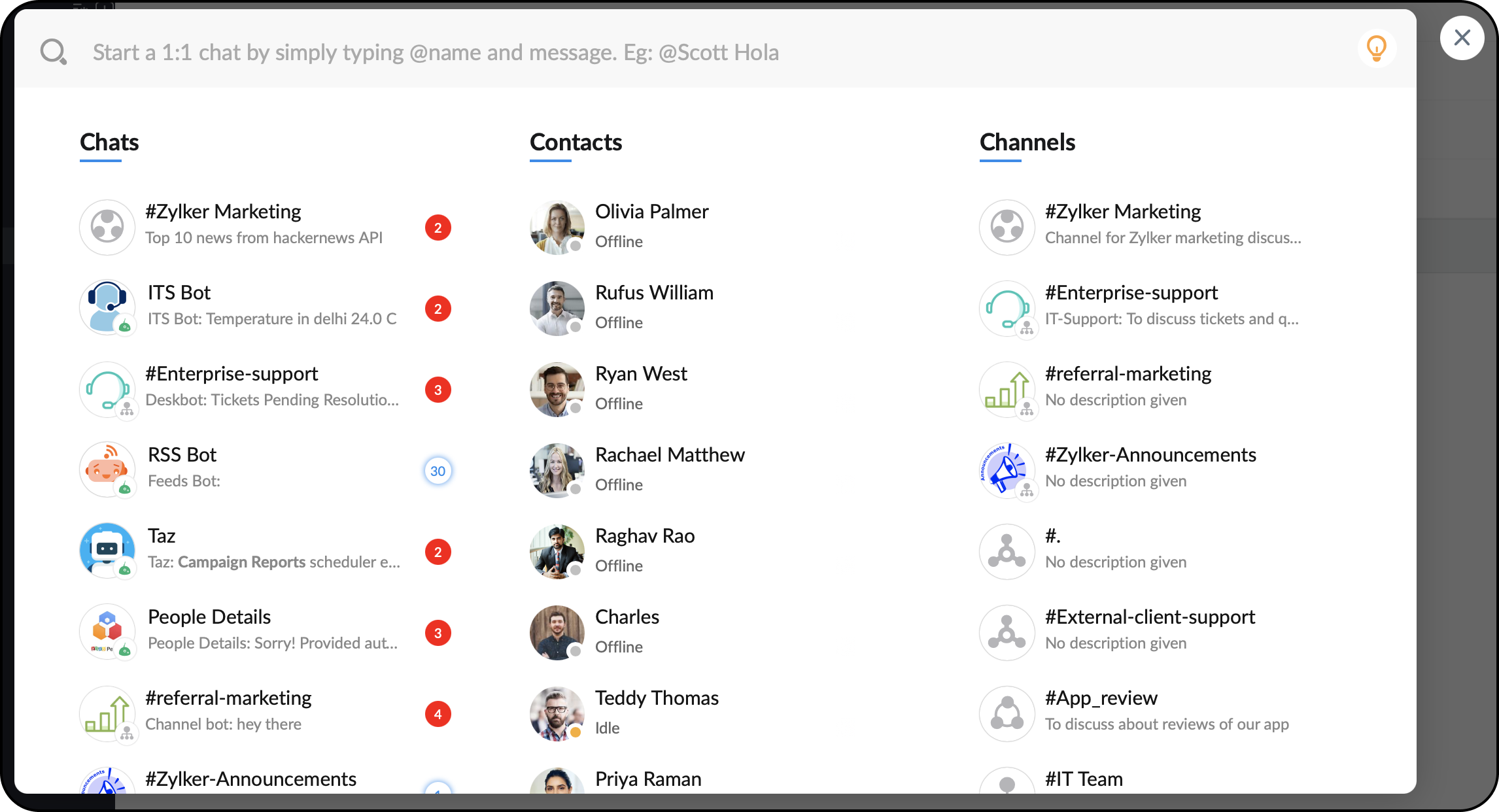1. 他のZohoアプリからスマートチャットを開くためにショートカットキー ctrl+space を使用するか、ミニチャットバー内の検索をクリックしてください。