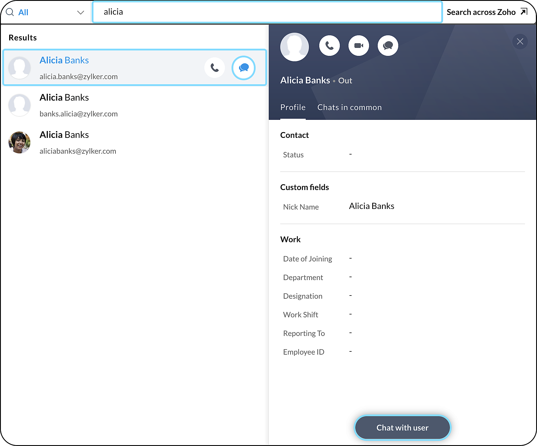 • 表示された提案から、ユーザー名ダイレクトメッセージアイコン、またはユーザーとチャットするボタンをクリックしてください。