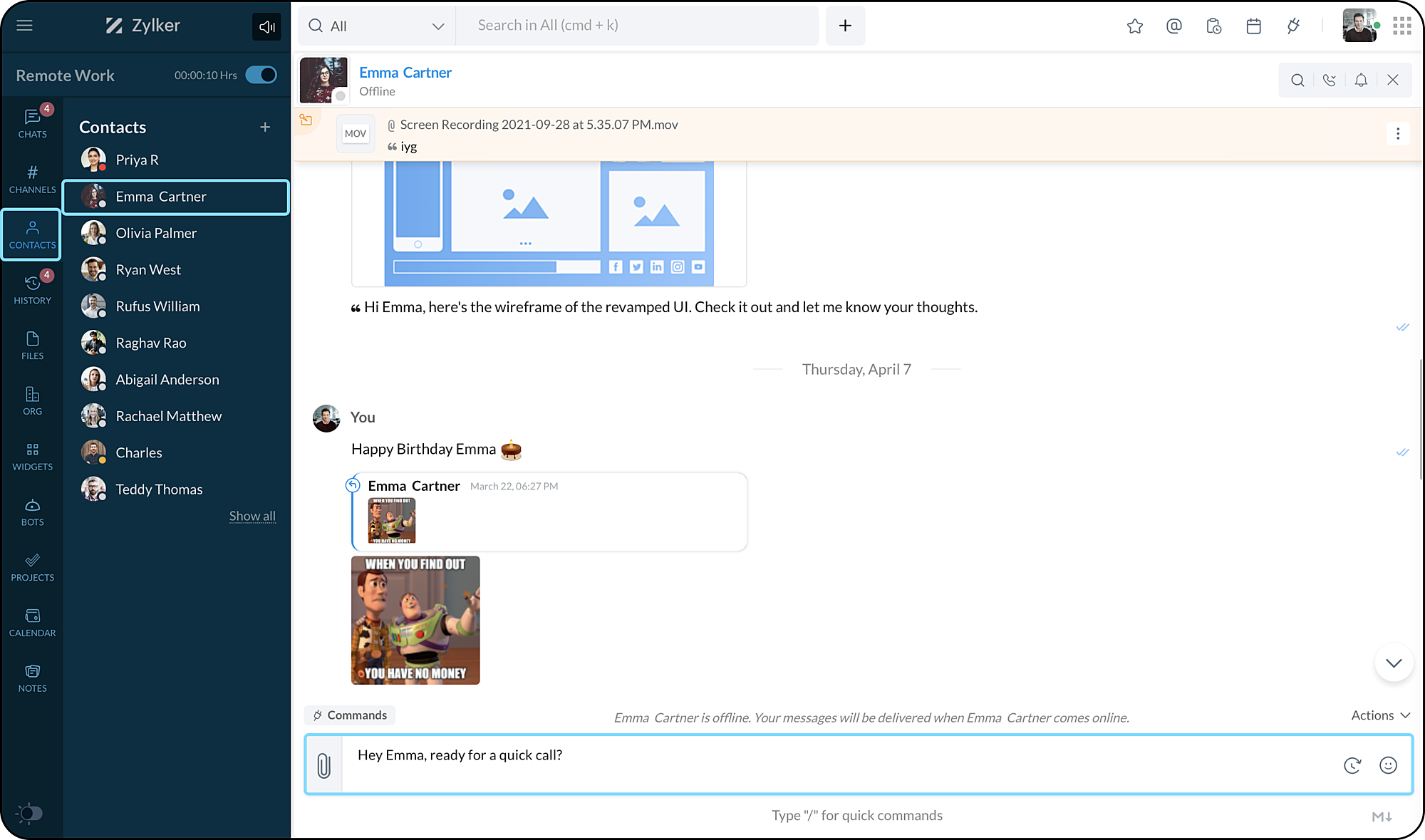 1. コンタクトの場合は、左サイドバーから「コンタクト」を選択し、ユーザー名をクリックします。チャットウィンドウが表示され、テキストエリアに送信したいメッセージを入力します。