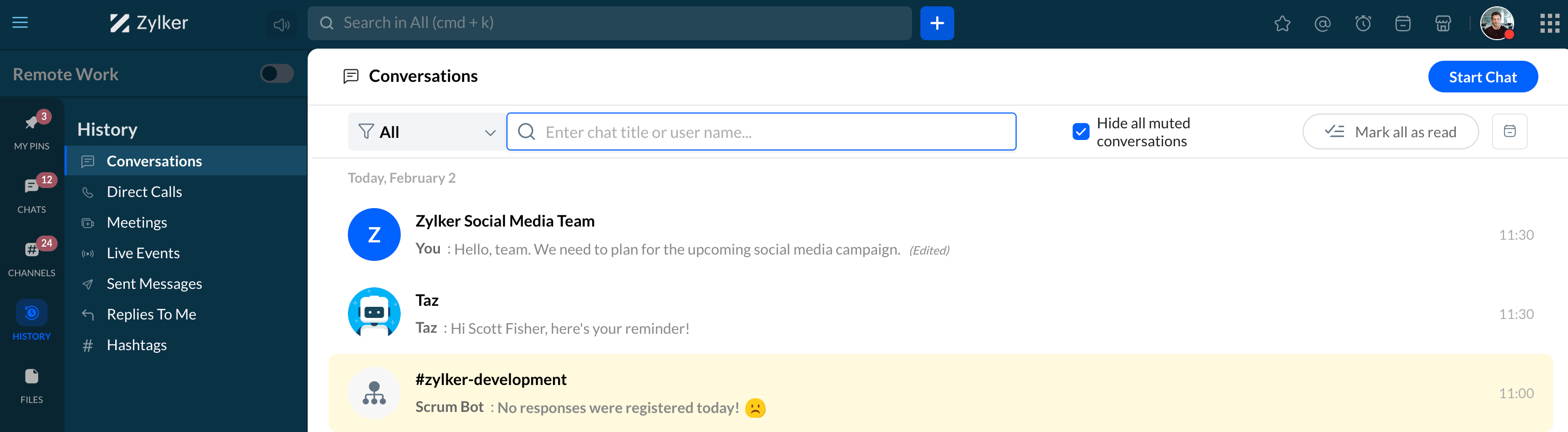 グループチャットは Cliq で削除できません。ただし、自分の画面から会話履歴を削除することはできます。