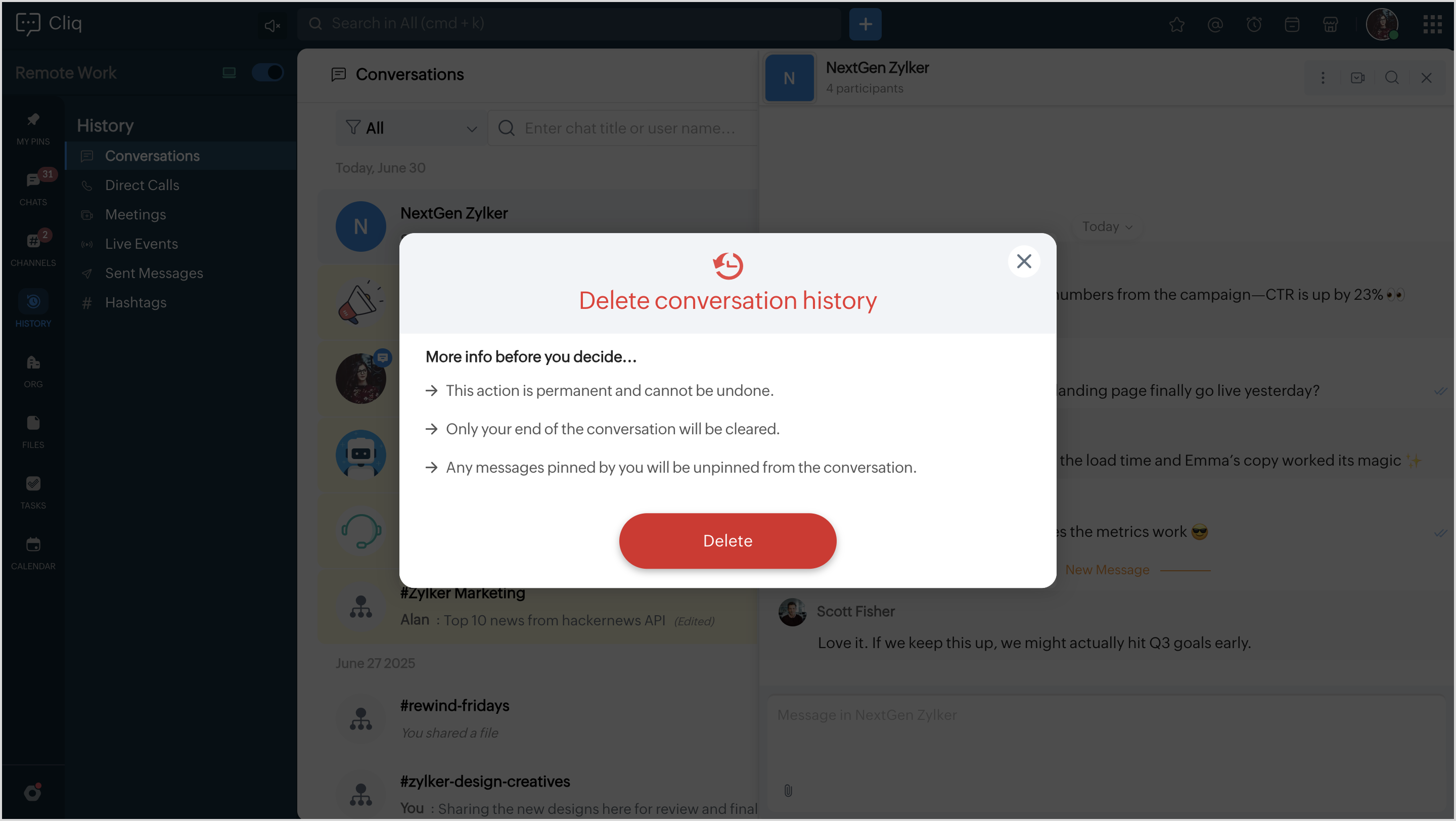 いいえ、グループチャットはCliqで削除できません。 ただし、ご自身の画面から会話内容をクリアすることは可能です。ですが、会話全体は他のグループメンバーには引き続き利用可能です。