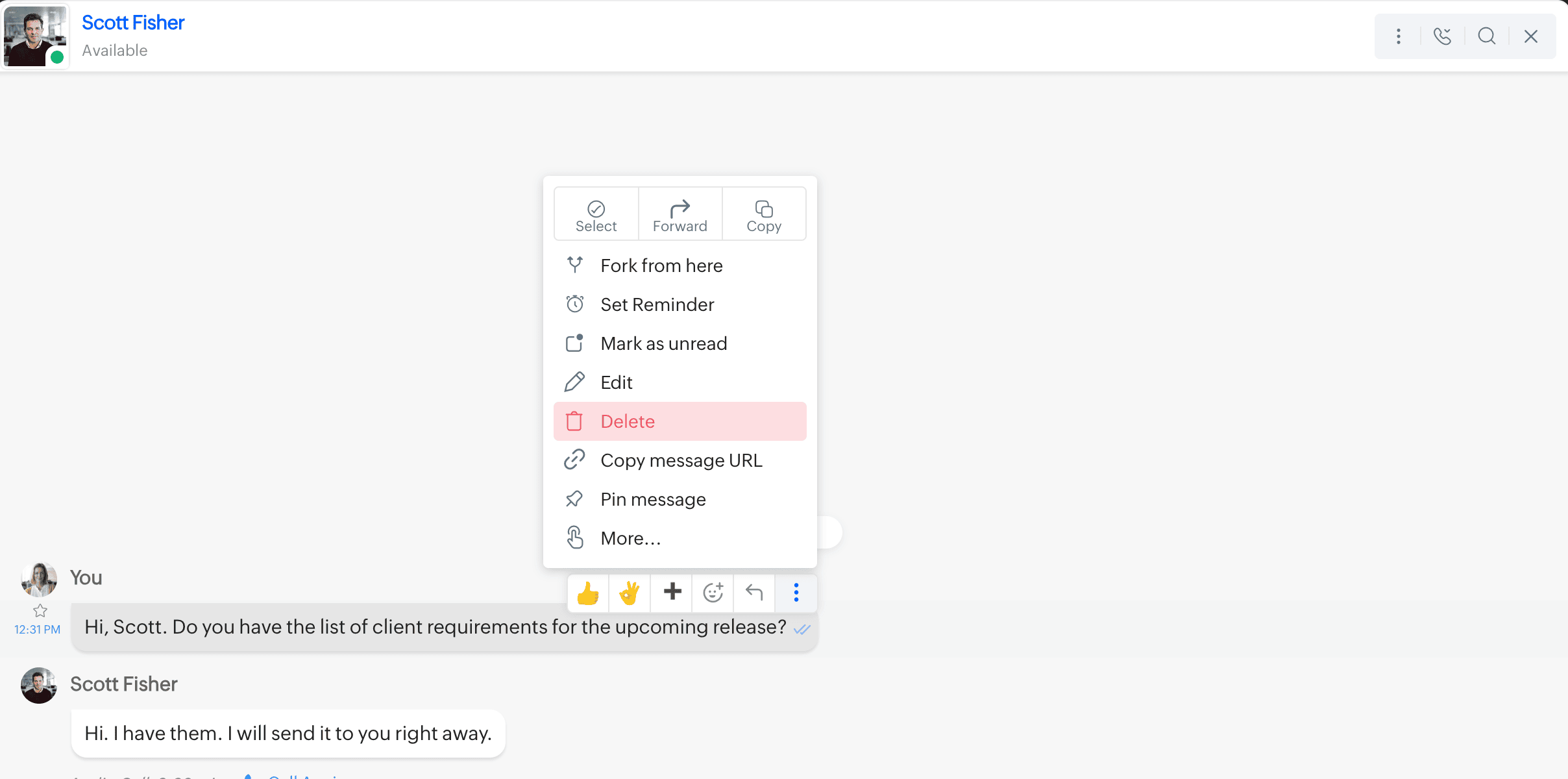 メモ: メッセージを削除できる時間の上限は、管理者が設定した内容によって異なり、1分〜730日の範囲で指定されます。これらの設定を変更できるのは管理者のみです。