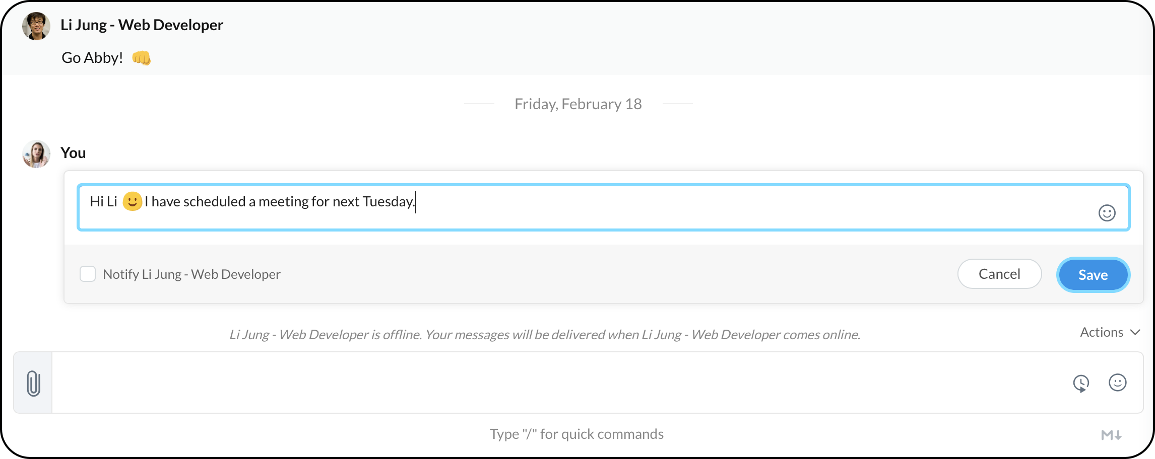 テキストエリアに表示されたものを入力して、編集したいテキストを入力します。チャット参加者に編集したメッセージを通知するためにチェックボックスをチェックすることもできます。