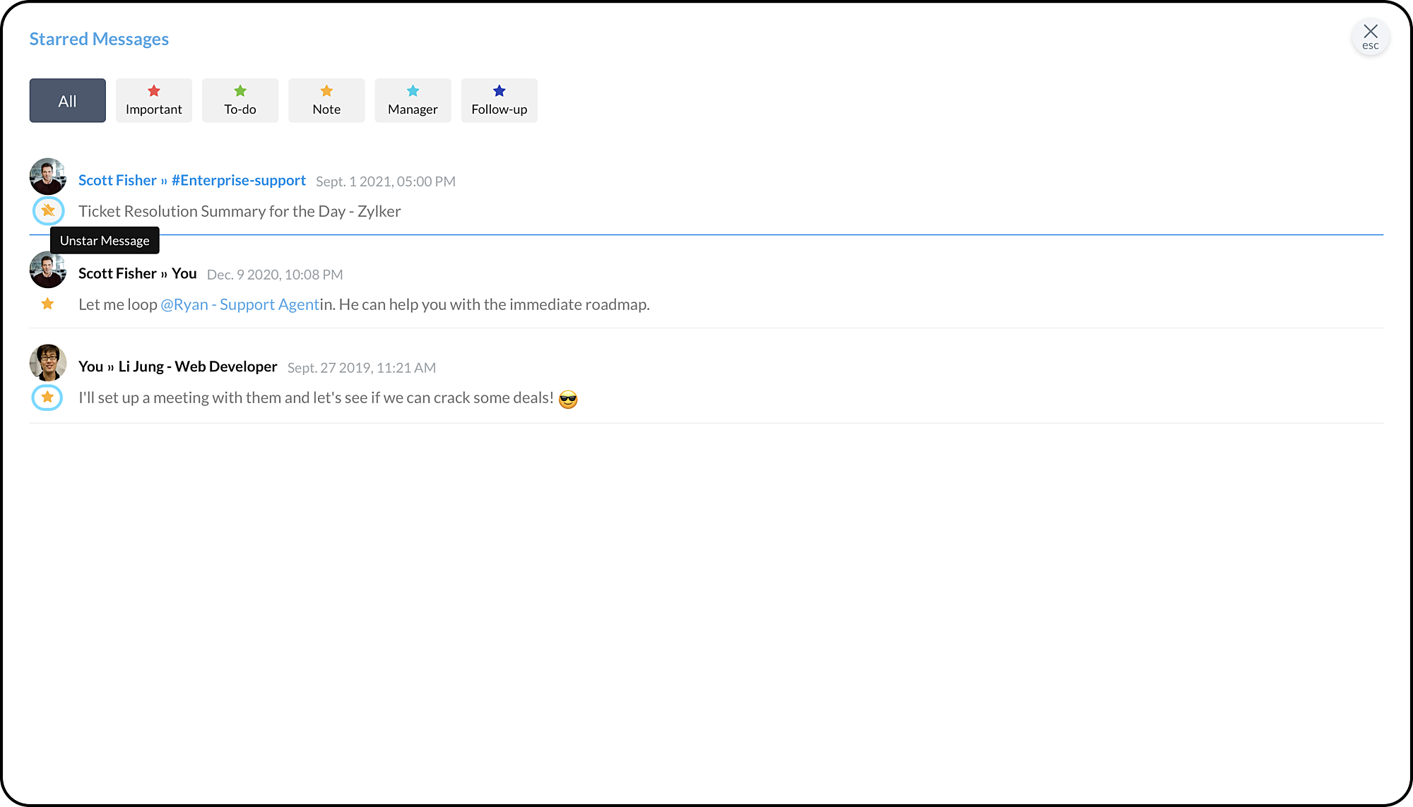 ヒント:スター付きのメッセージのカテゴリを変更することもできます。スター付きのメッセージにカーソルを合わせて、現在のスターアイコンをクリックしてアンスターにし、リストからカテゴリを選択します。
