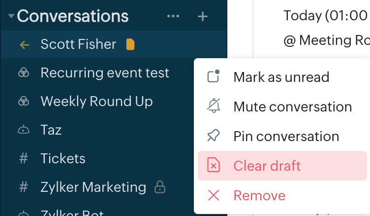 メッセージを送信せずにチャットウィンドウを閉じた場合でも、入力したテキストは Cliq にメッセージの下書きとして保存されます。