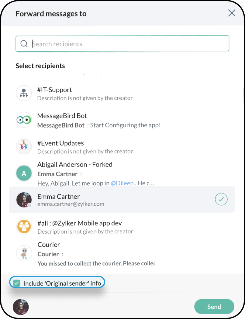 元の送信者情報を含める」を選択すると、どの個人またはチャネルからこのメッセージが転送されたかが表示されます。
