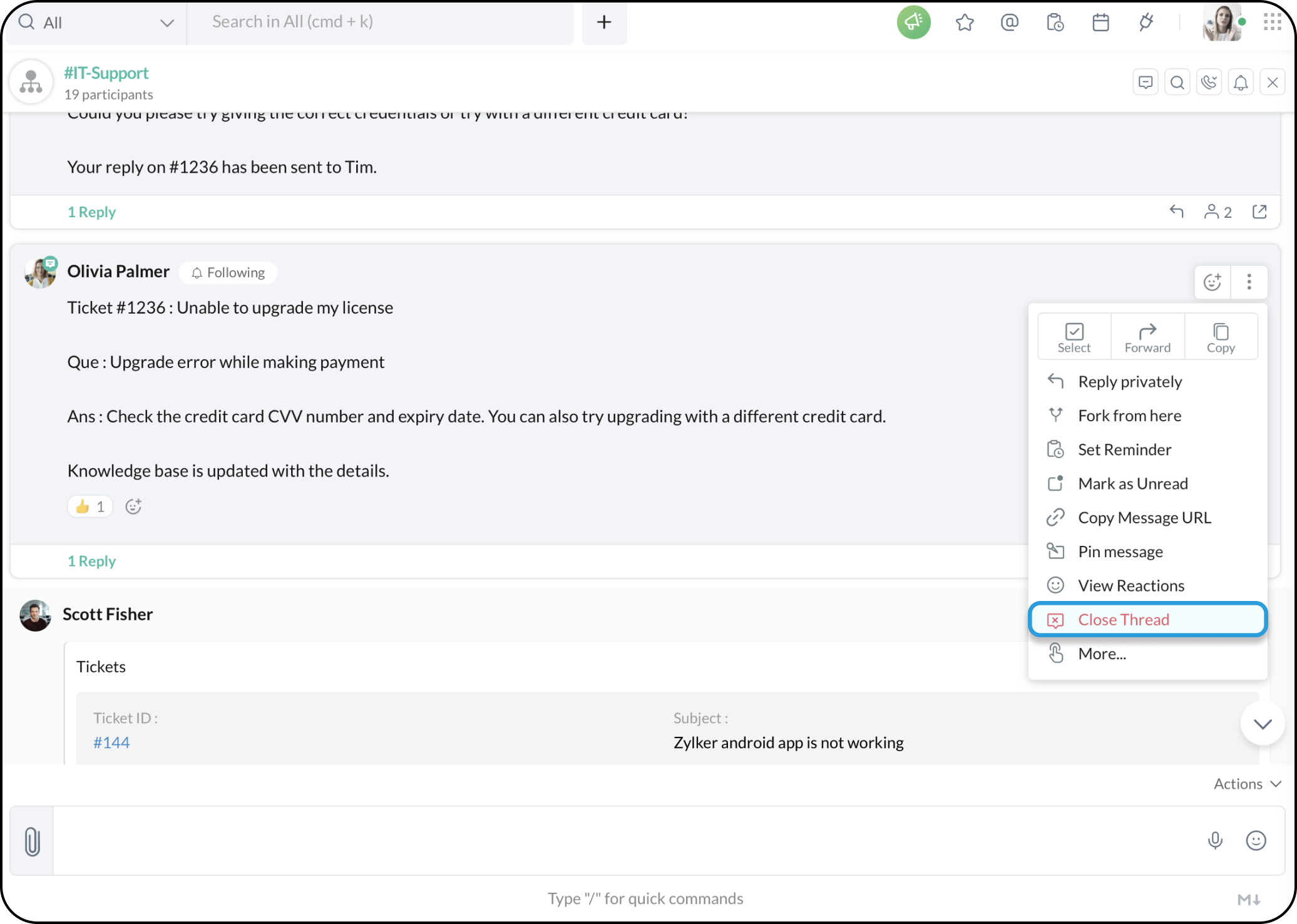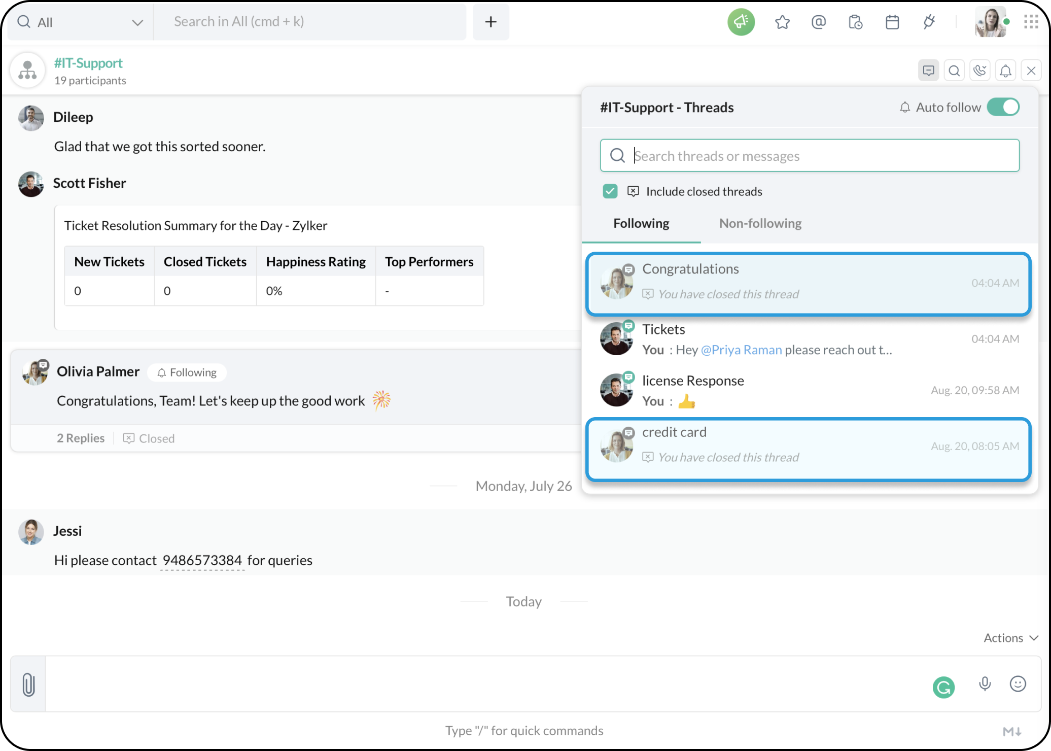 スレッドを閉じると、スレッドのステータスが「閉じられた」と更新されます。すべてのスレッドセクションから閉じられたスレッドを表示することができます。