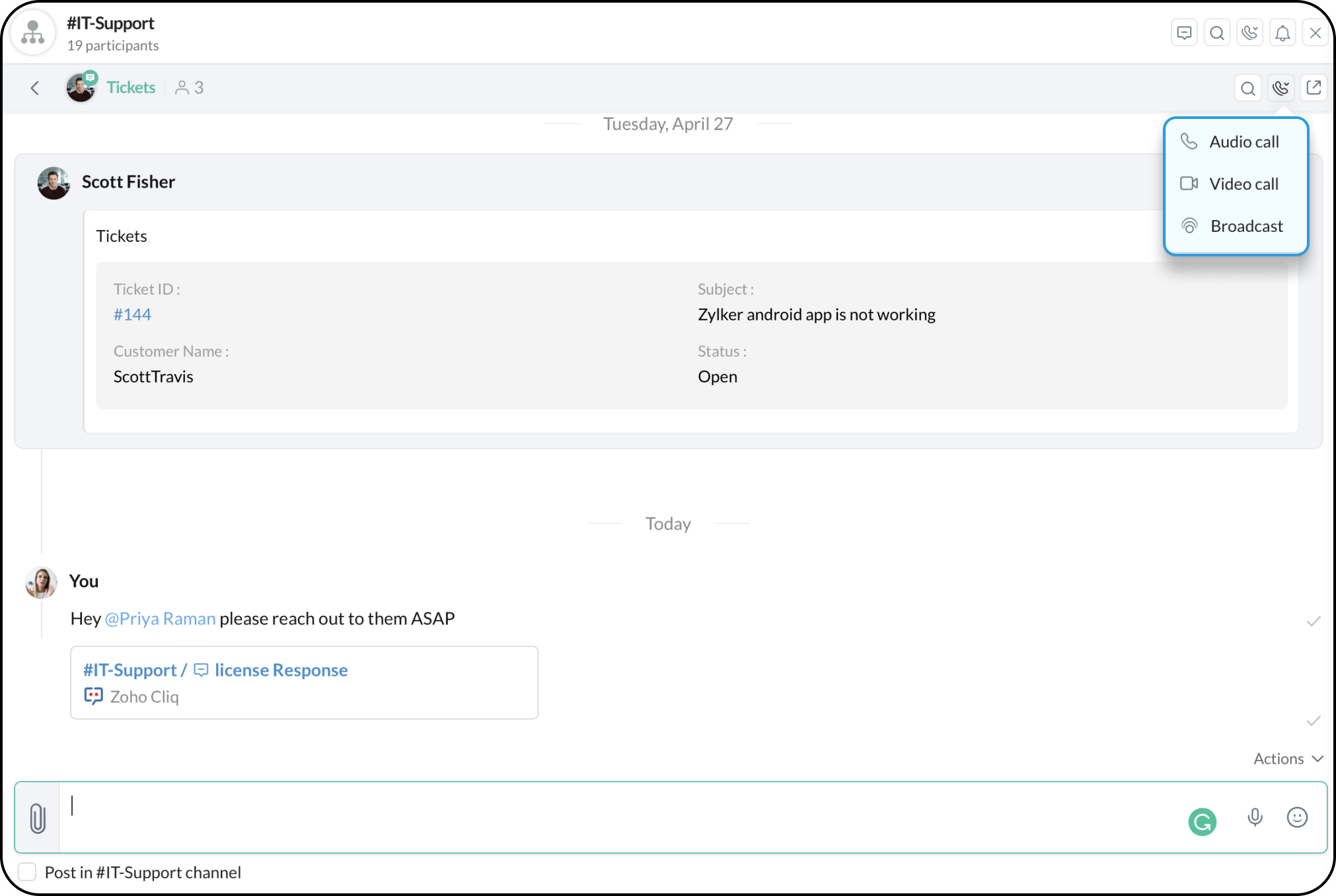 スレッド内での通話を行うと、スレッドのフォロワーだけがリングで通知されますが、他のチャンネル参加者も参加したい場合は参加できます。 スレッド内での通話を行うには: