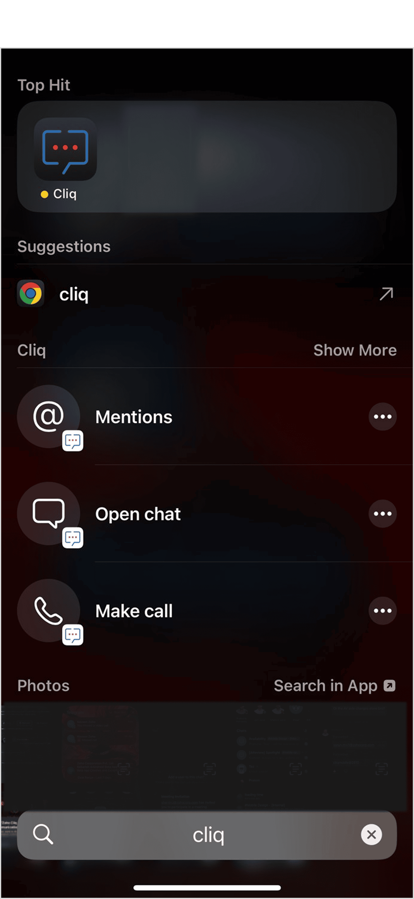 iOSデバイスの検索機能でZoho Cliqを検索すると、Zoho Cliqアプリ内での最近の活動に基づいた候補が表示されます。