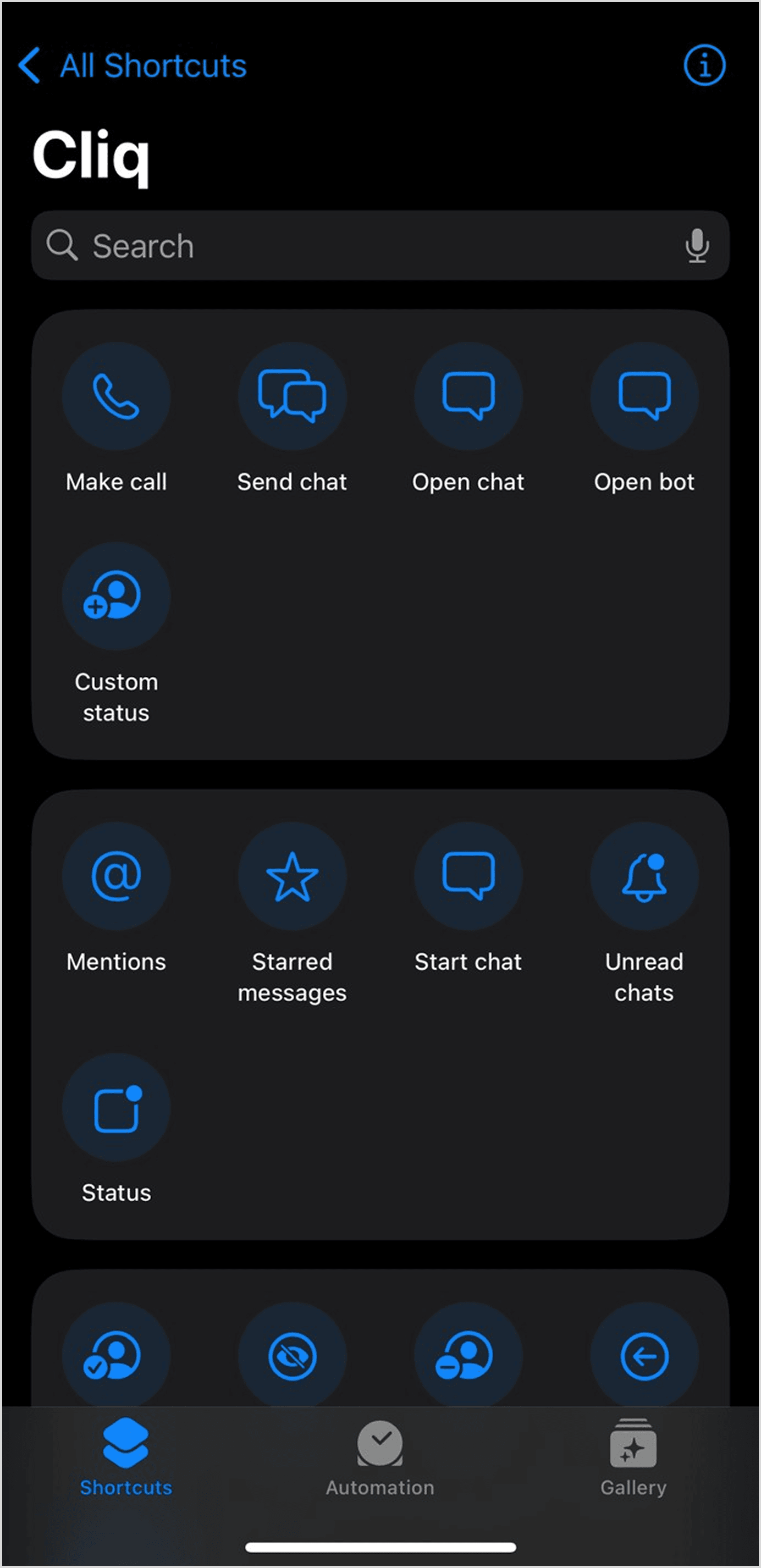 • iOSデバイスにShortcutsアプリがインストールされていることを確認してください。Zoho Cliqで行った処理に基づき、すべての利用可能なショートカットが表示されます。