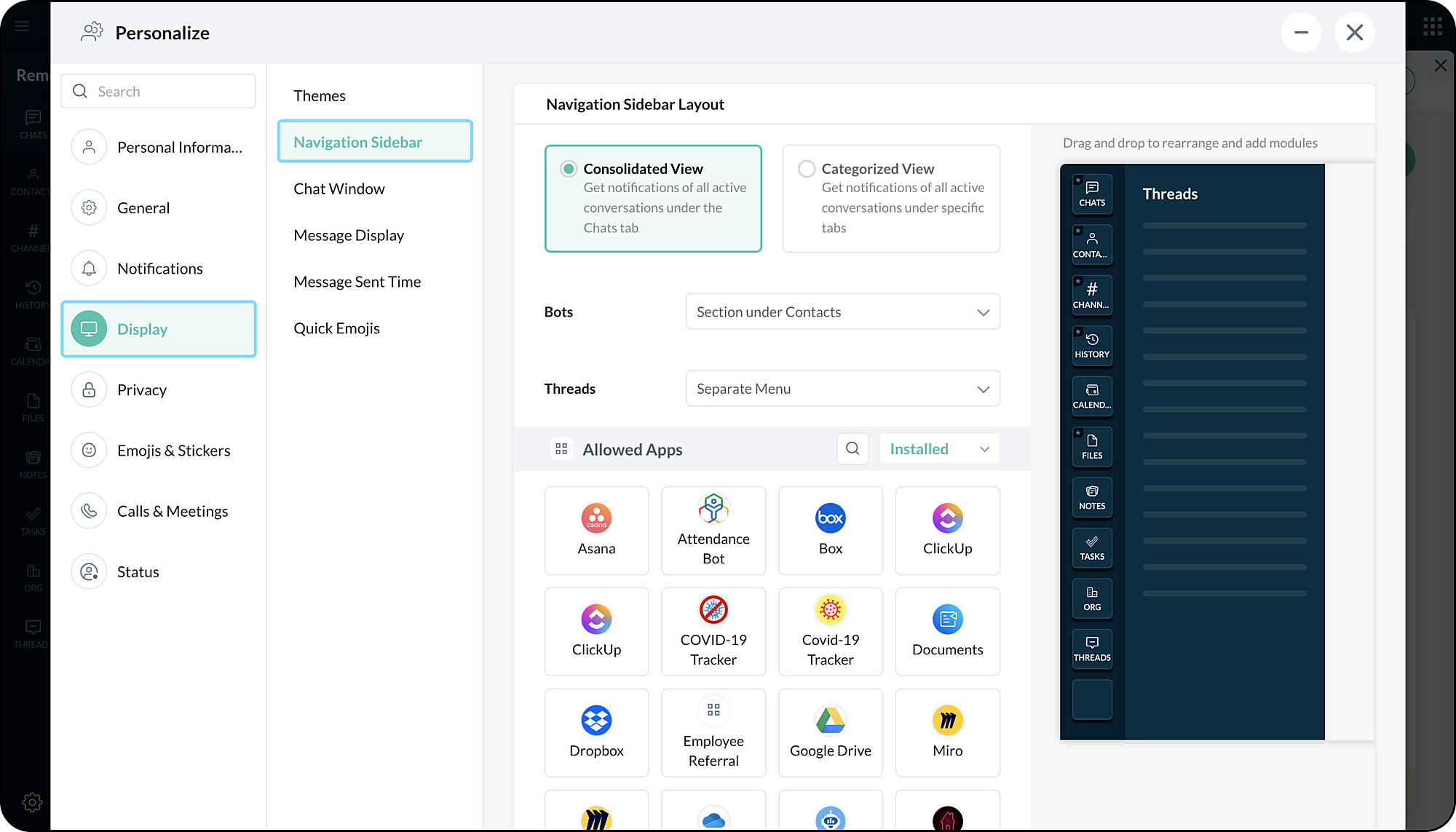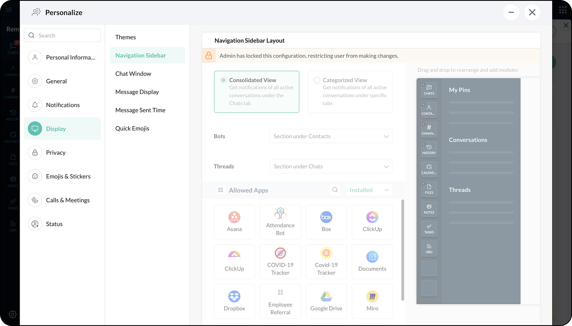 管理者がモジュールの配置を制限していない場合のみ、ユーザーはナビゲーションサイドバーをカスタマイズすることができます。