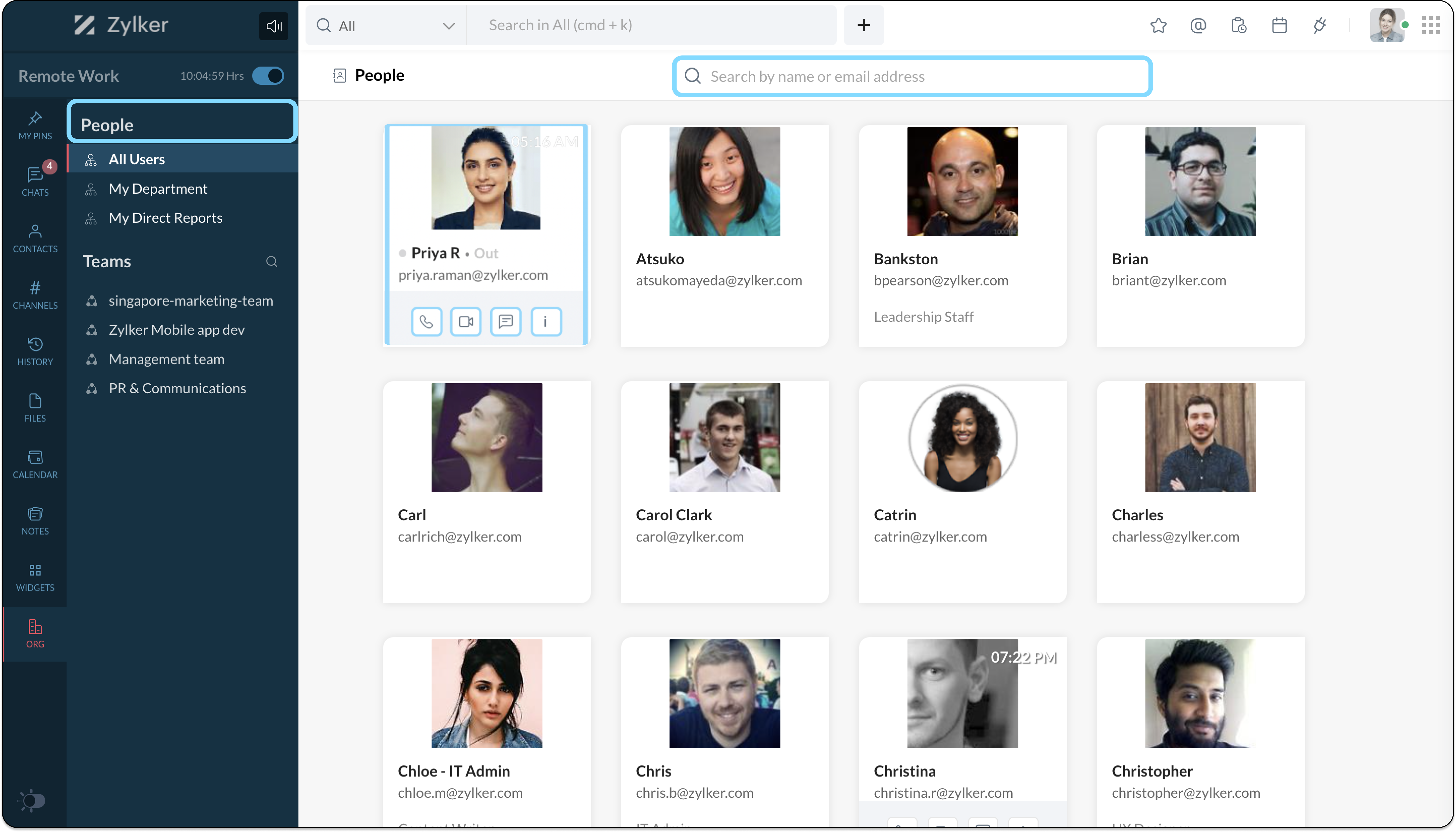 組織の人々がカードビューで表示されていることがわかります。以下のアクションを実行するには、カード上にマウスを置き、オーディオ/ビデオ通話を行うオプションが表示されます。チャットボタンをクリックすると、そのユーザーとチャットすることができ、情報(i)ボタンをクリックすると、プロフィールの詳細を表示できます。