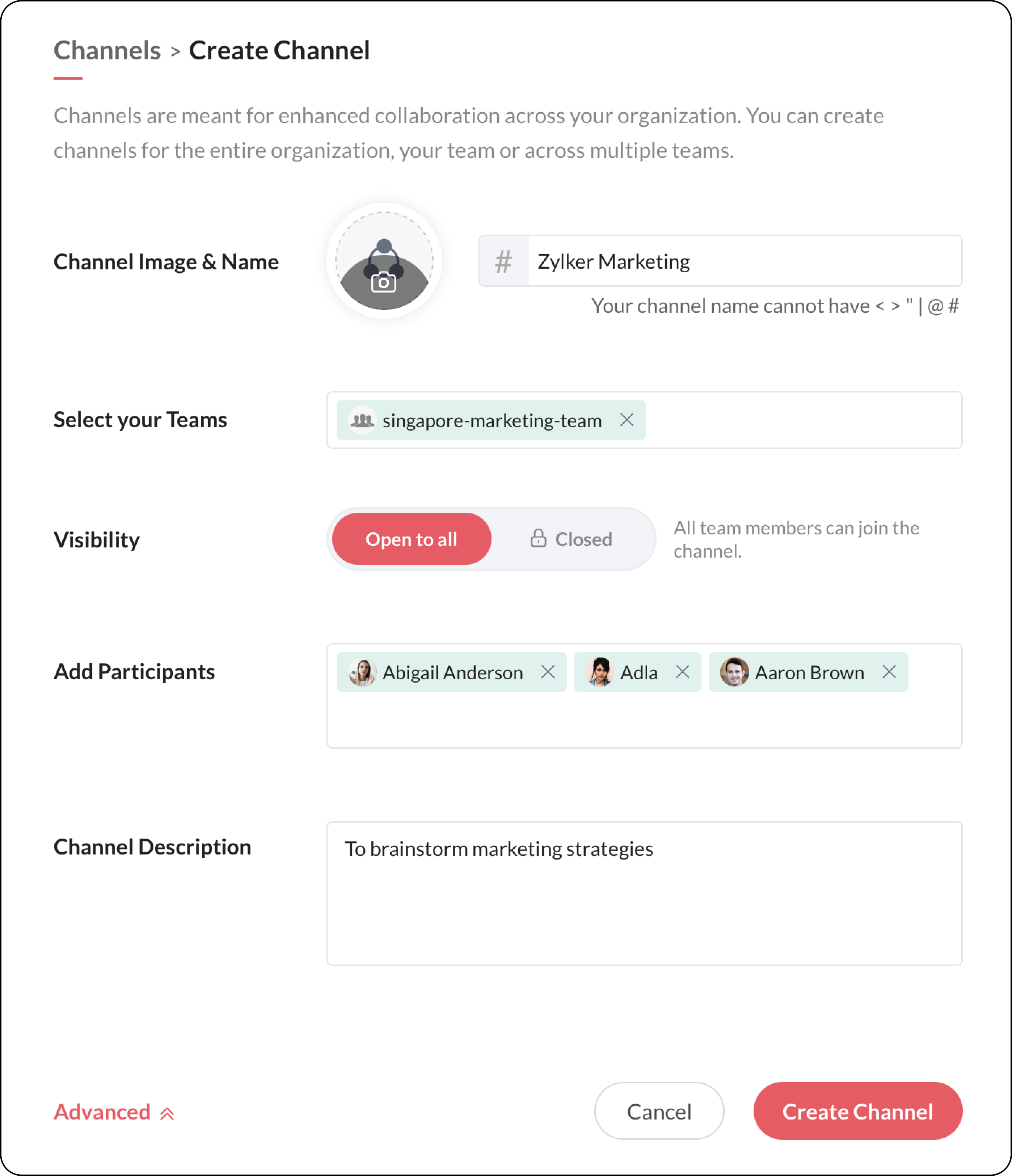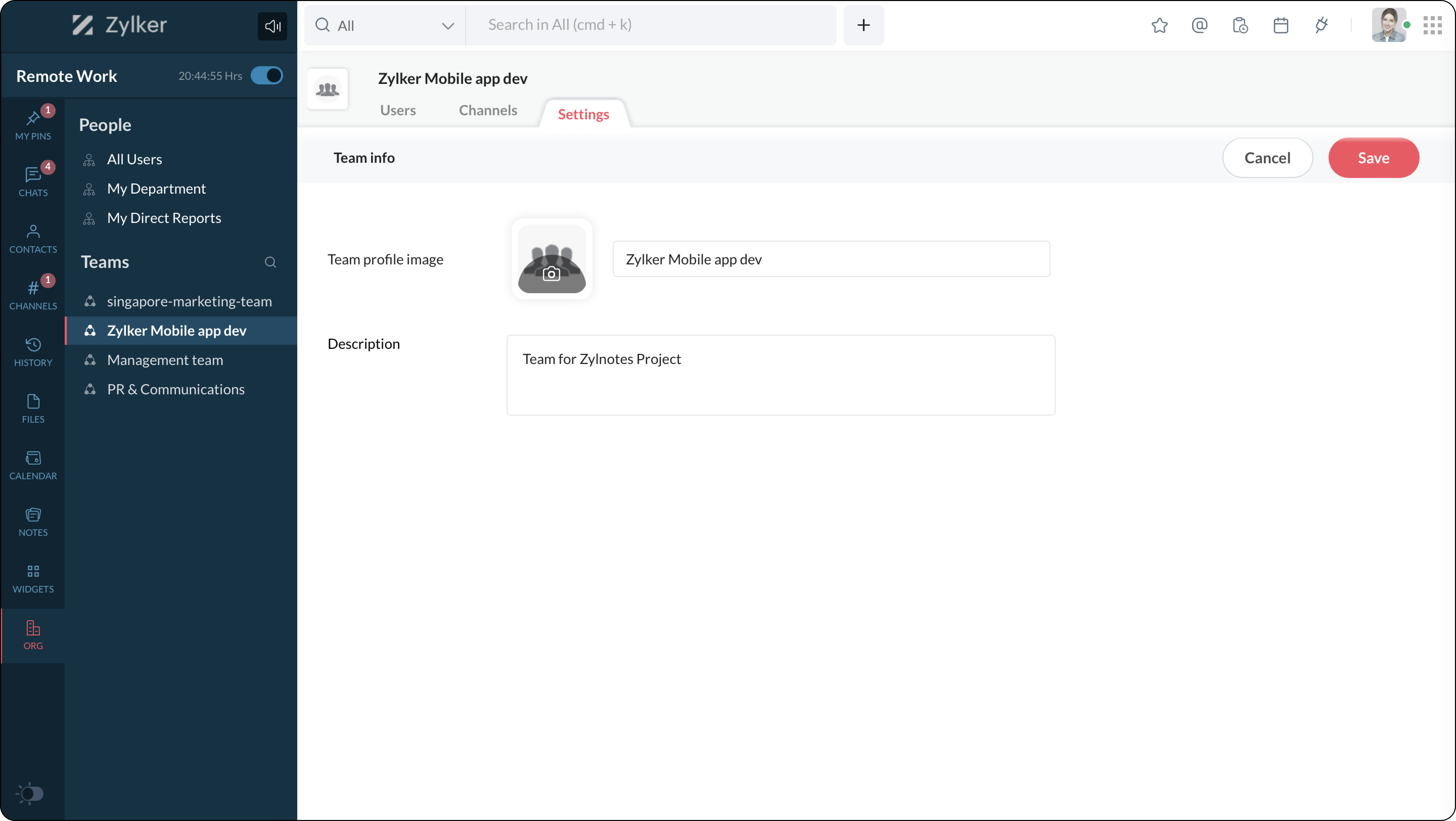 設定タブを介して、カメラアイコンをクリックしてチームプロフィール画像をアップロードし、チームの名前を入力し、説明欄にチームの説明を入力することができます。