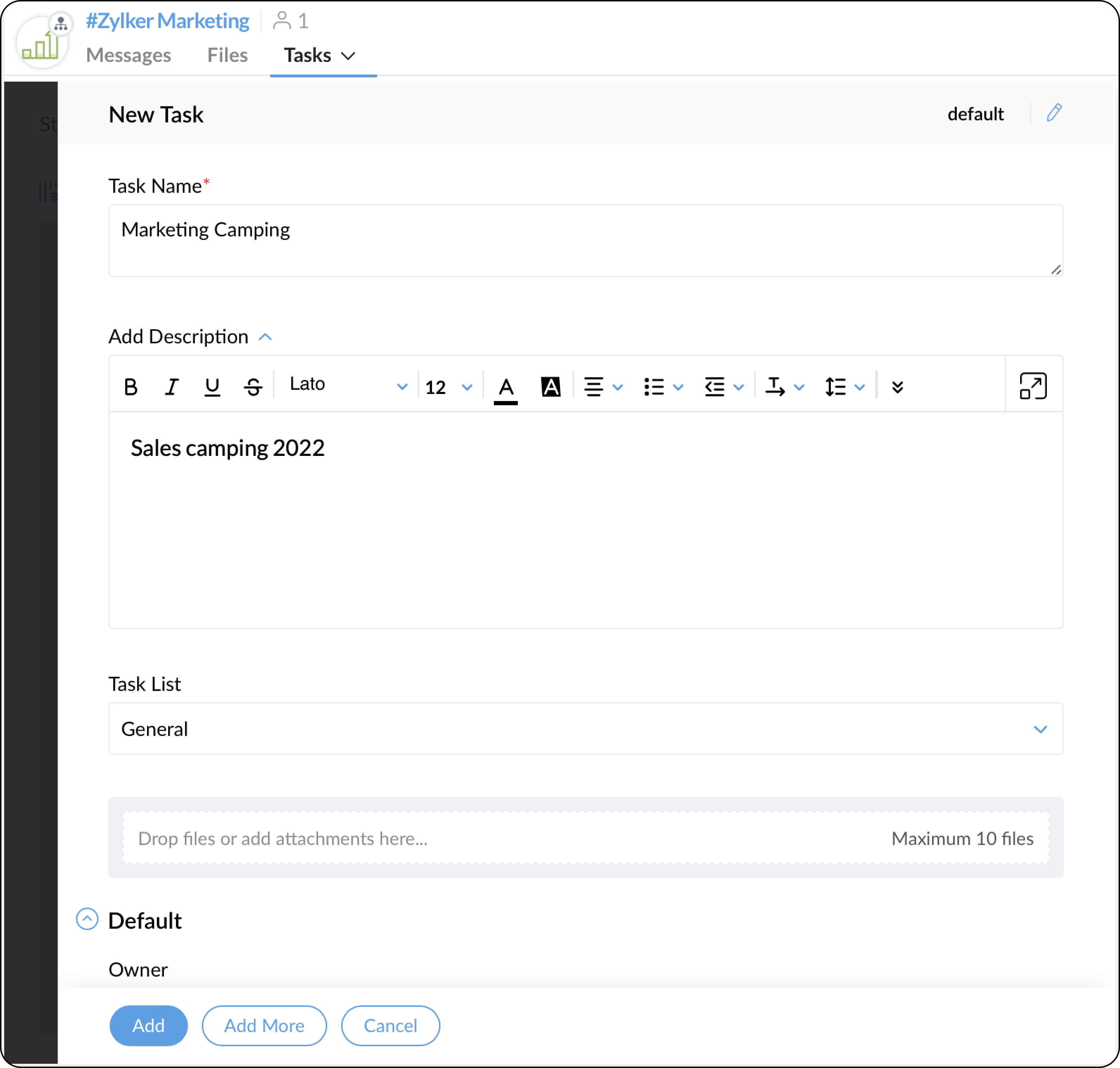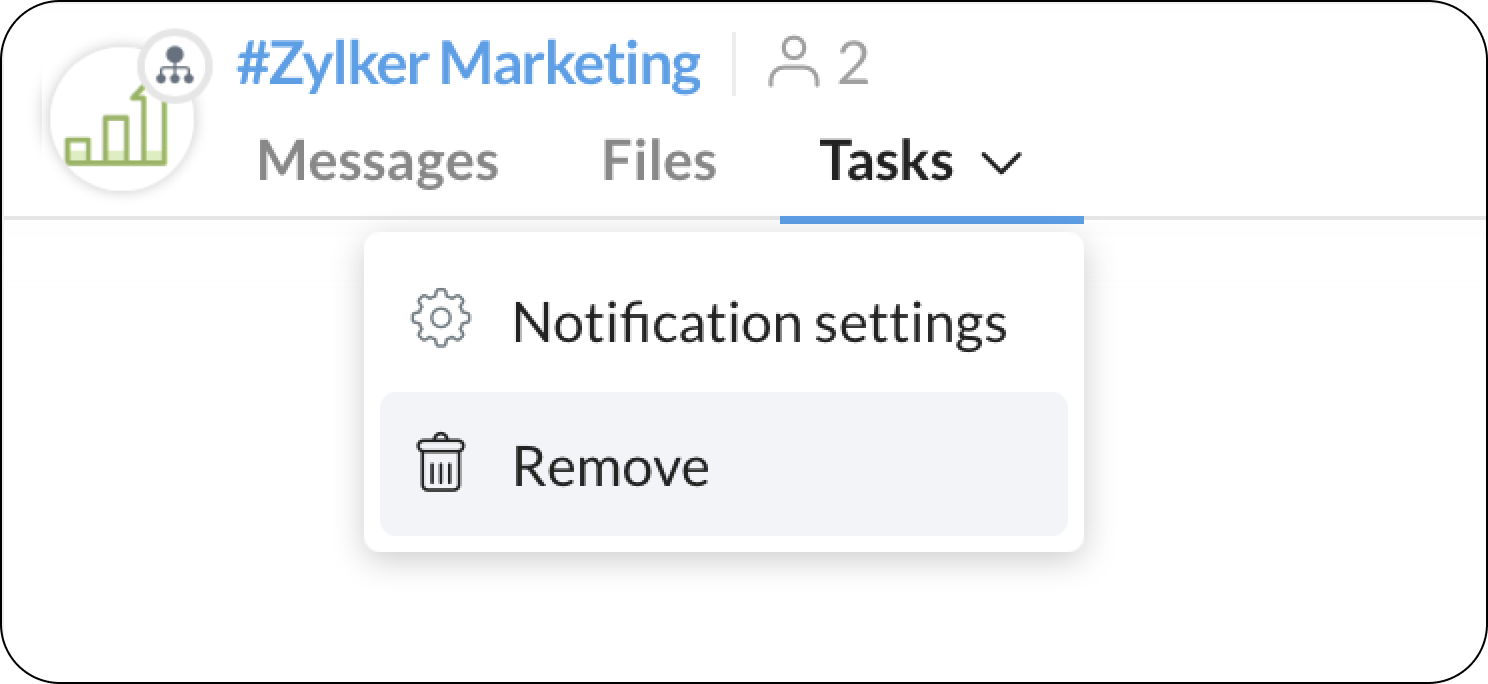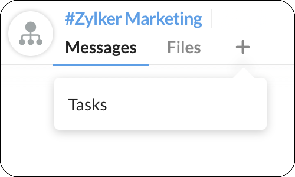 Zohoプロジェクトを有効にしたら、チームおよび組織レベルのチャネルにタスクタブを追加できます。タスクタブを追加するには、以下の手順を実行してください。