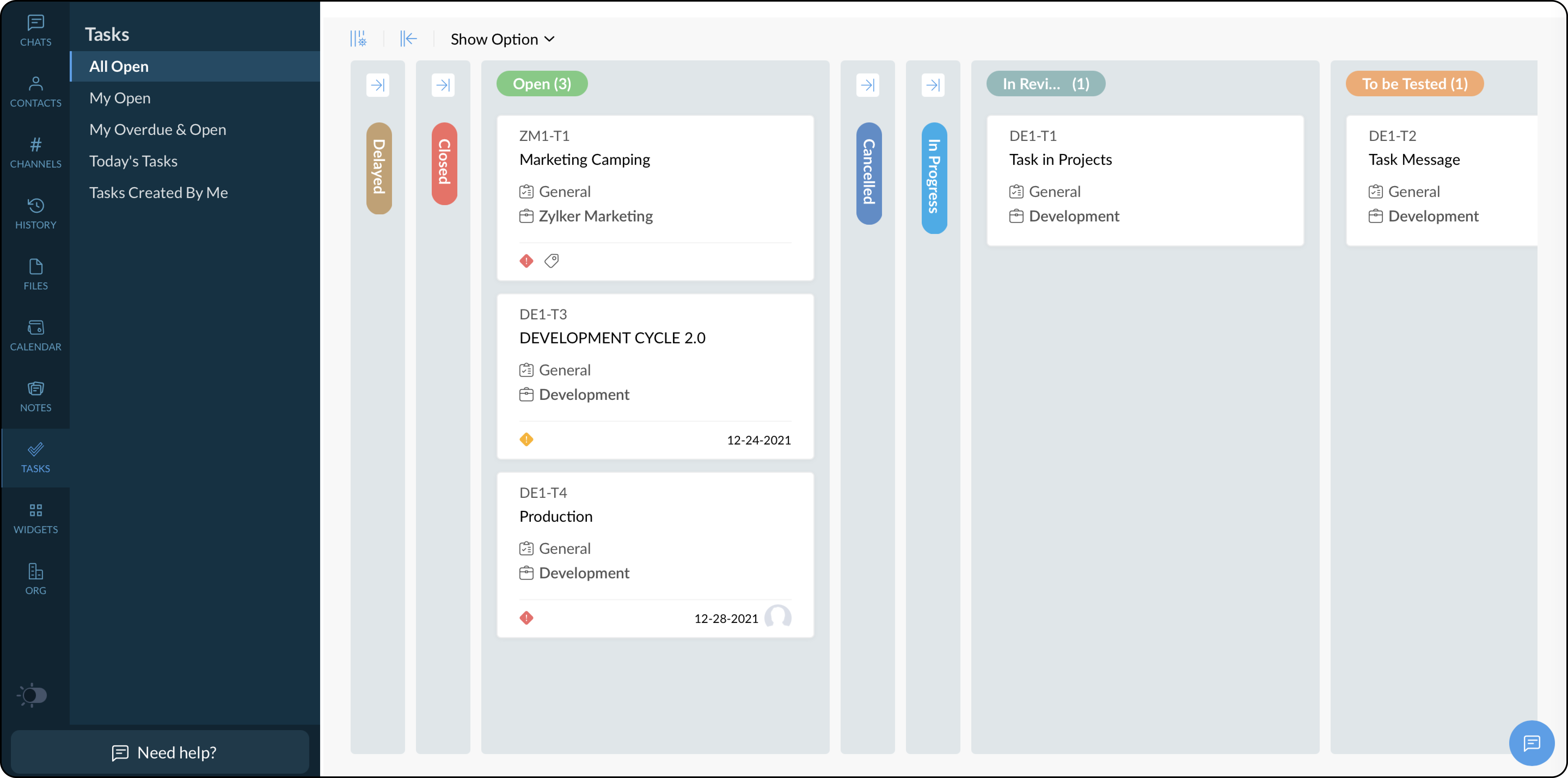 すべてのタスクを表示するには、「タスク」セクションをクリックしてください。次のセクションに分類されたすべてのタスクを表示できます:すべてのオープン、私のオープン、私の遅延およびオープン、今日のタスク、私が作成したタスク。