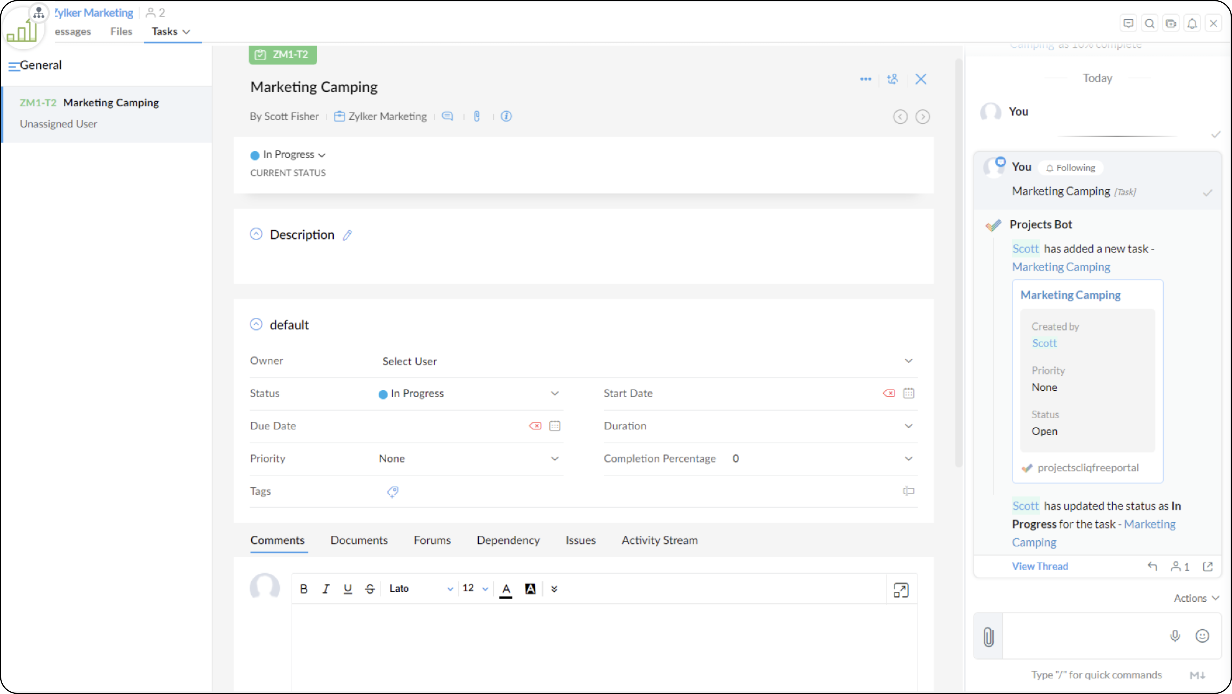 タスク」セクションでは、Cliqを使用してタスクを追加、管理、追跡することができます。タスクセクションは、Zoho Cliqの有料アカウントを使用しているユーザーにのみ利用可能です。Zoho CliqとProjectsの有料ユーザーには、タスクセクションがプロジェクトセクションに置き換えられます。プロジェクトセクションの利点は、プロジェクト内のすべての問題を表示し、プロジェクトの有料プランに付属するすべての機能をCliqのプロジェクトセクションから利用できるということです。