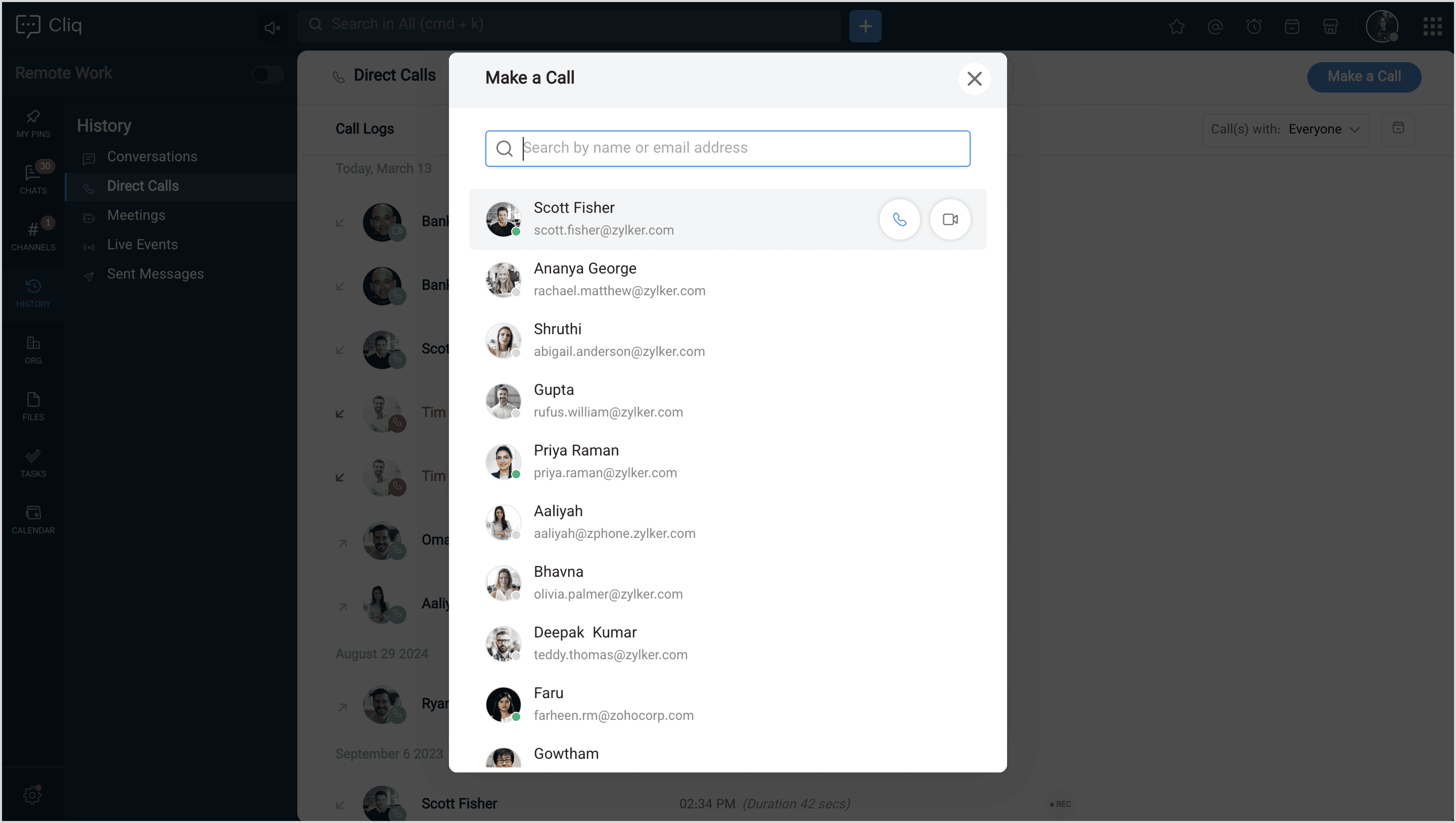 • 通話を開始する: 通話を開始する ボタンをクリックして、即座に音声またはビデオ通話を開始します。