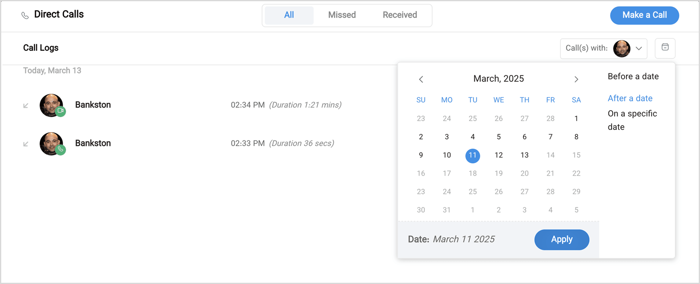 • 日付でフィルターを適用:特定の日またはその前後の通話を表示する日付を選択します。
