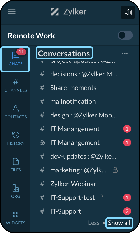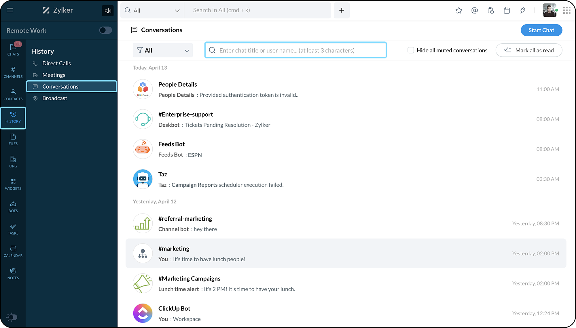 • チャット履歴を検索するには、「チャット」の下の「会話」の「すべて表示」をクリックしてください。