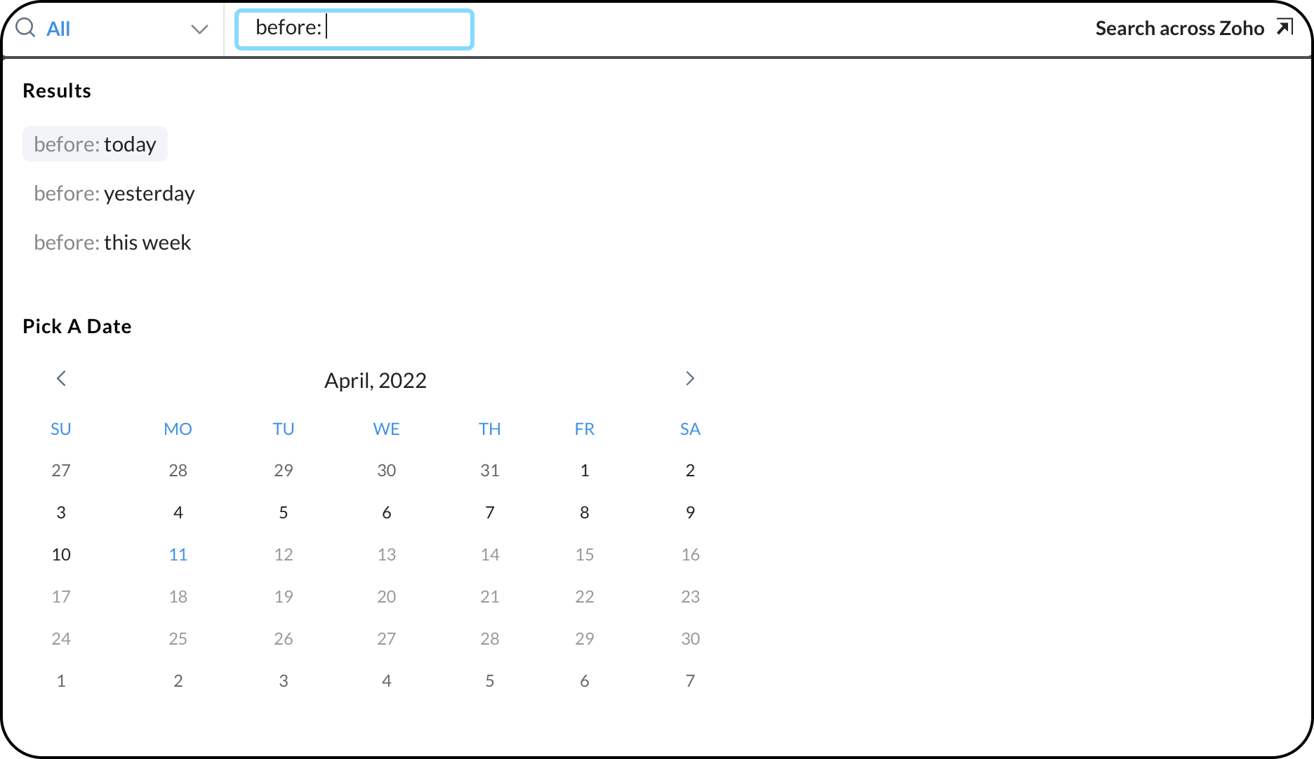 例えば、日付の前のチャットを検索したい場合は、検索バーに「今日昨日今週」などのサジェストが表示されます。オプションを選択するか、カレンダーから日付を選択することもできます。