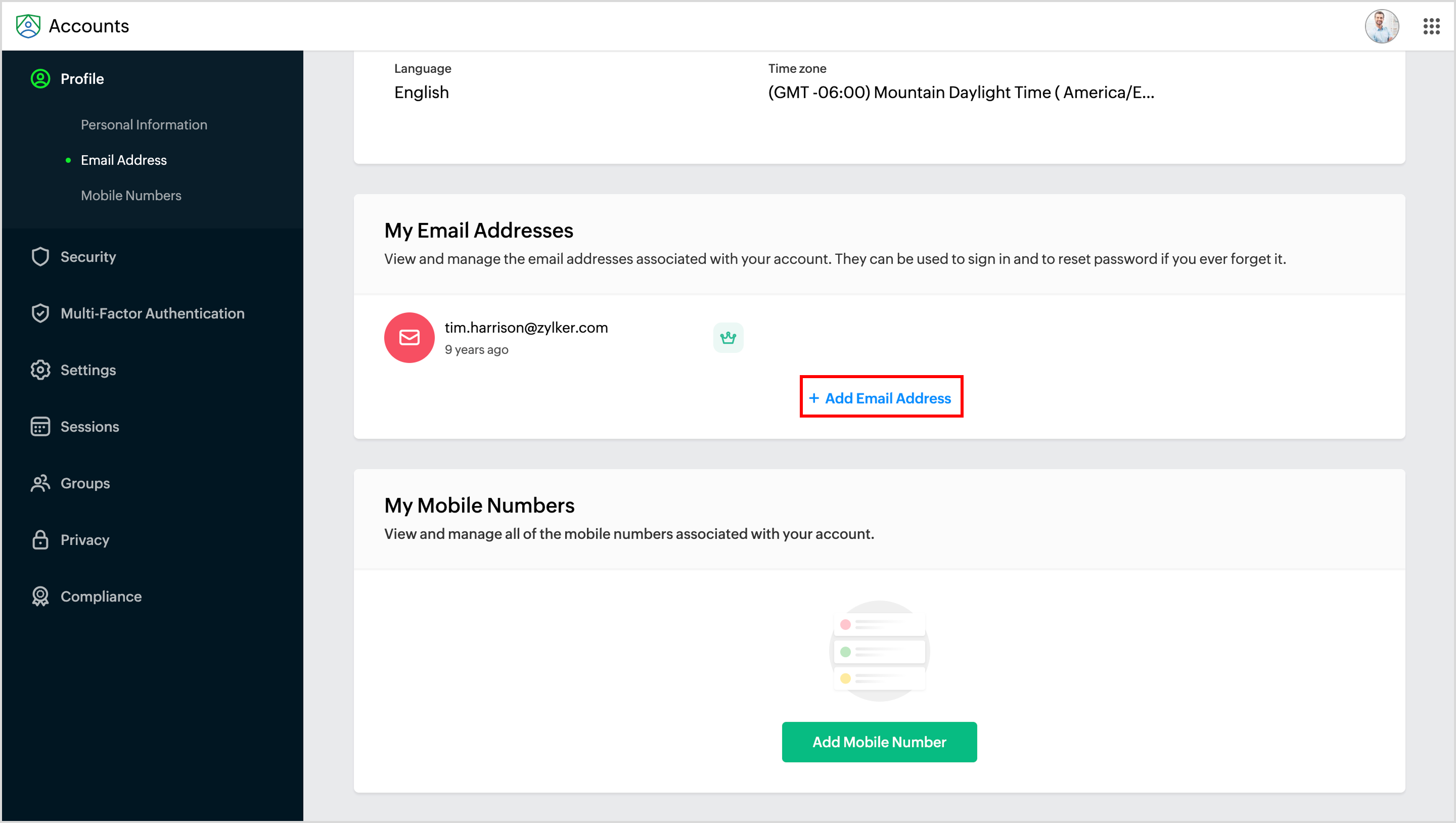 1. いずれの場合も、Zohoアカウントページに移動します。左側のサイドバーでメールアドレスをクリックし、追加する メールアドレスを「My メール Addresses」の下で選択してください。