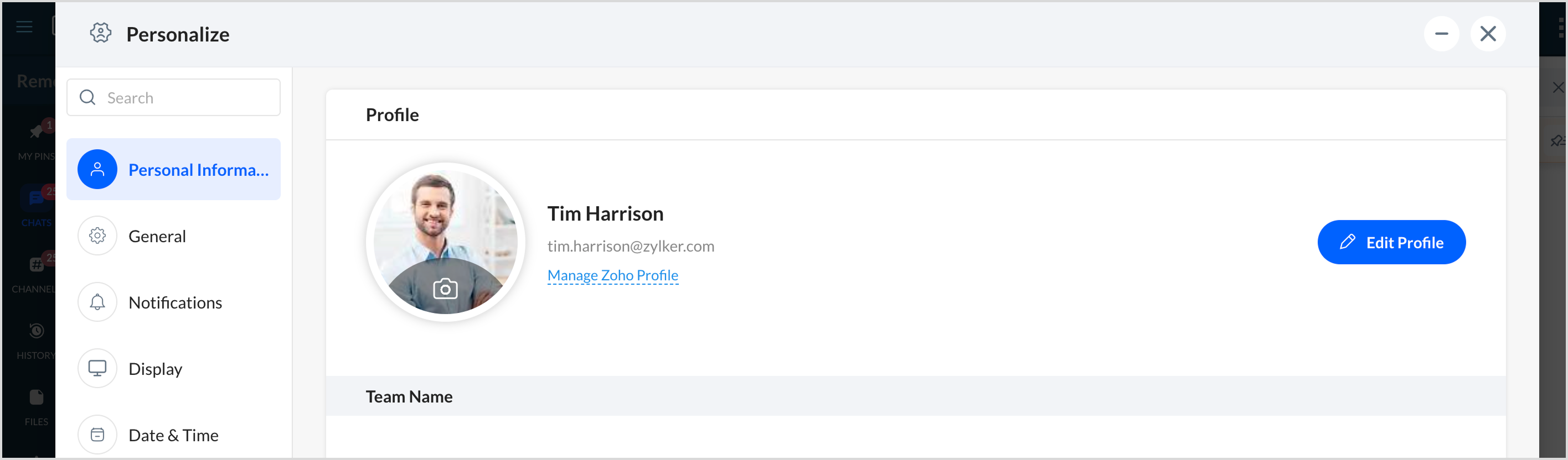 1. または、ユーザーパネルに移動し、権限 & 設定をクリックします。その後、Personal Informationを選択し、管理 Zoho 権限をクリックします。
